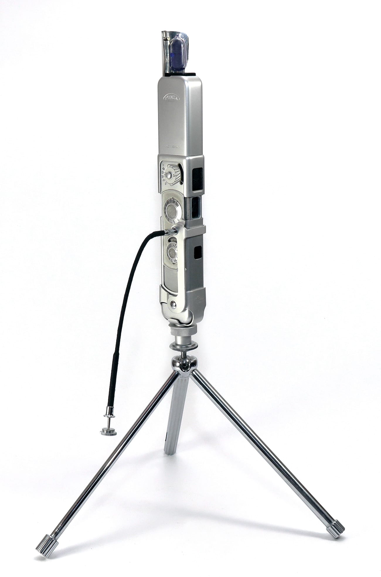 Der eingebaute Belichtungsmesser ist im Ruhezustand arretiert und wird nur während der Messung durch Druck auf einen Knopf freigegeben. Der Belichtungsmesser ist mit dem Verschluss gekuppelt: Die Verschluss-Skala wird so gedreht, dass eine Dreiecksmarke auf den Zeiger des Belichtungsmessers weist – schon ist die Belichtungszeit richtig eingestellt. Da die Minox stets mit voller Blendenöffnung 1 :3,5 arbeitet, entfällt die Überlegung, aus der Vielzahl der Möglichkeiten ein Paar aus Verschlusszeit und Blendenzahl auszuwählen.“