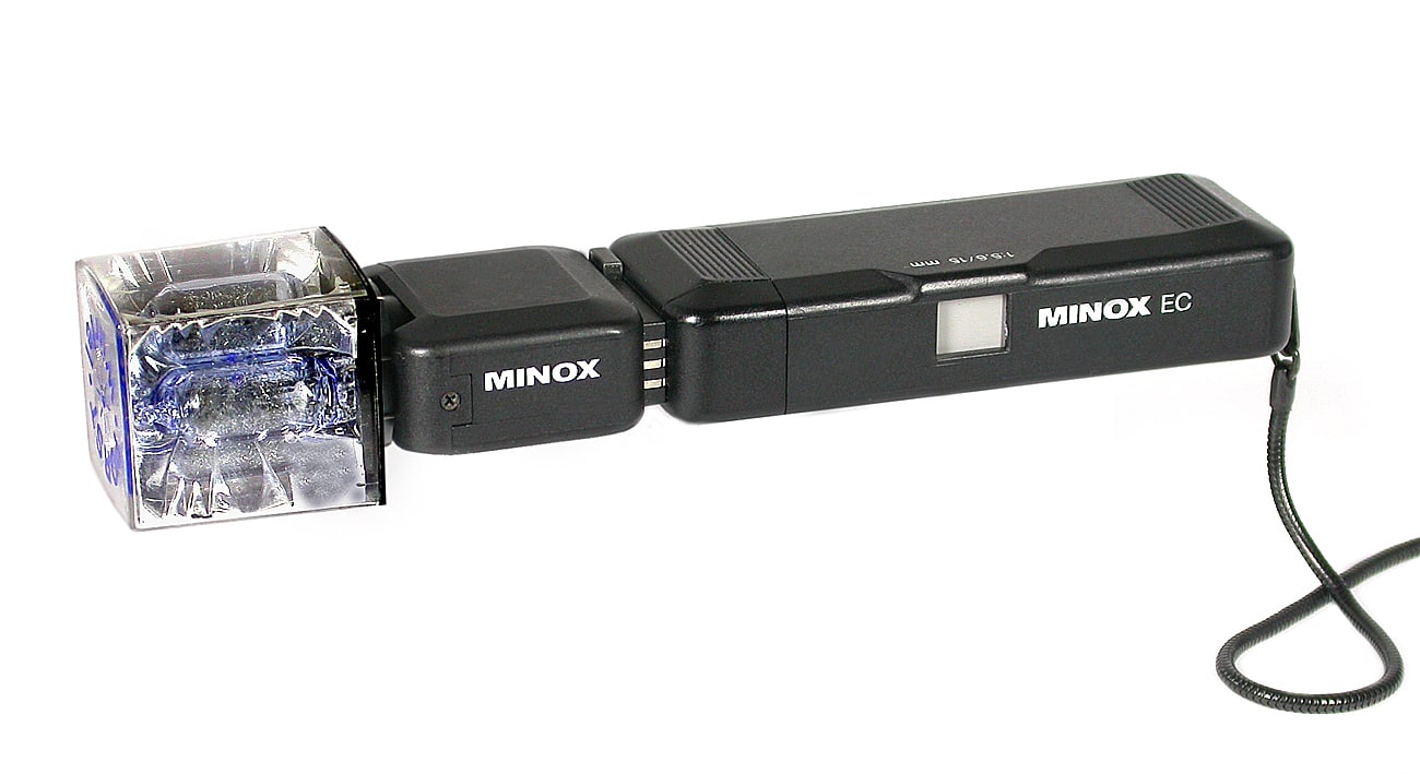Eine heutzutage seltsam anmutende Blitzlösung: ein Hightech-Gerät von Kamera und dazu ein Blitzwürfeladapter. Hier abgebildet mit aufgestecktem Blitzwürfel und der zugehörigen Kamera, der Minox EC (in geschlossenem Zustand).