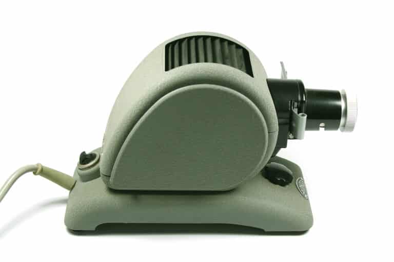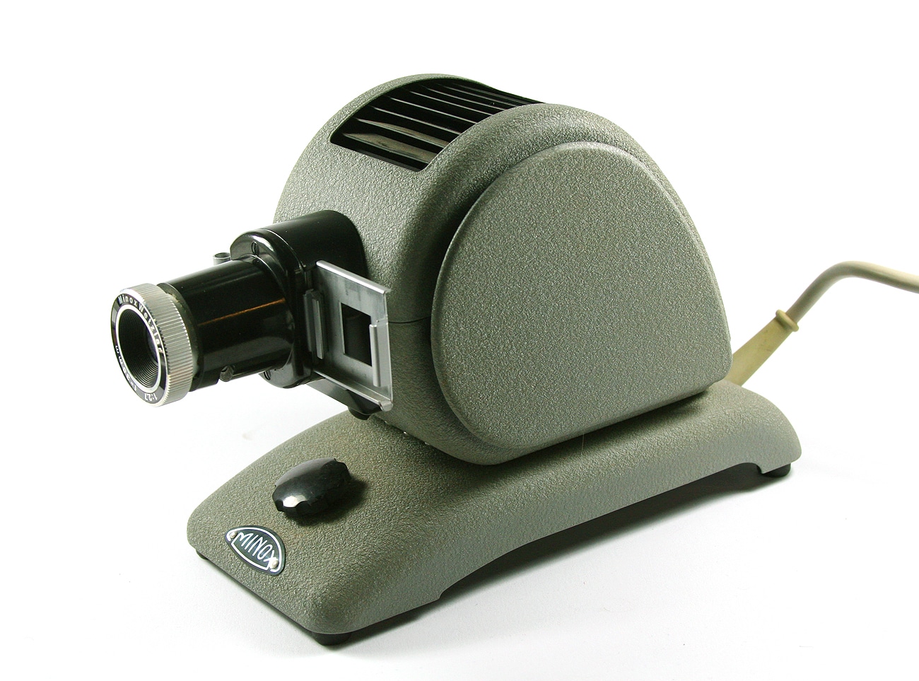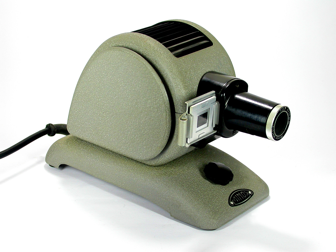 Diaprojektor für Minox-Dias (8 x 11 mm), gebaut nach 1956. Spannung: 110 bis 220 Volt (Gleich- oder Wechselstrom), Lampe: 100 Watt (ohne Gebläse), Wechselschieber. Gehäuse höhenverstellbar, vergütetes Objektiv: Minox 1:2,7/35 mm. Geeignet für Kleinstbilddias bis zu einem Format von 15 x 15 mm (Außenformat 30 x 30 mm).