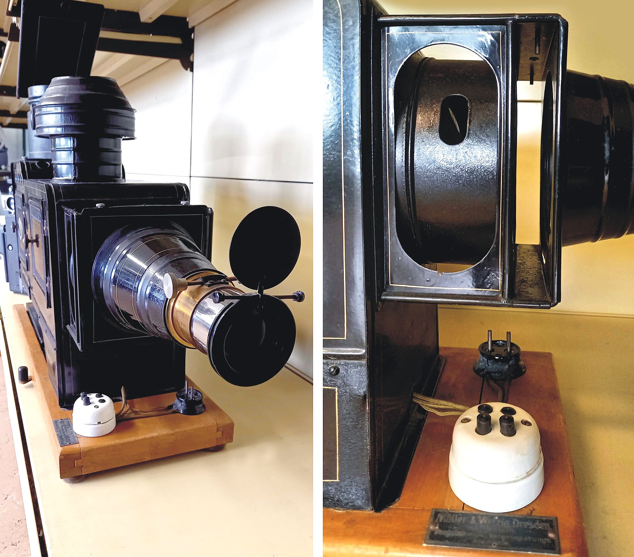 Hinter diesem Kamin befindet sich in einem Schacht das Objektiv für die Projektion von Bildern und Texten auf die Leinwand (Episkop). Unterhalb des Projektionsgerätes befindet sich eine Hebevorrichtung, mit der die Buchseiten, Fotos, Postkarten oder Texte an das Gerät zum Zwecke der Projektion herangedrückt werden. Die nutzbare Auflagefläche ist 14 x 14 cm. Das Epidiaskop hat eine Länge von 85 cm, eine Höhe von 55 cm, eine Tiefe von 26 cm. Beim Museumsexemplar fehlt der aus Holz gefertigte Schieber zur Aufnahme der Glasdias im Format von maximal 8,5 x 10 cm.