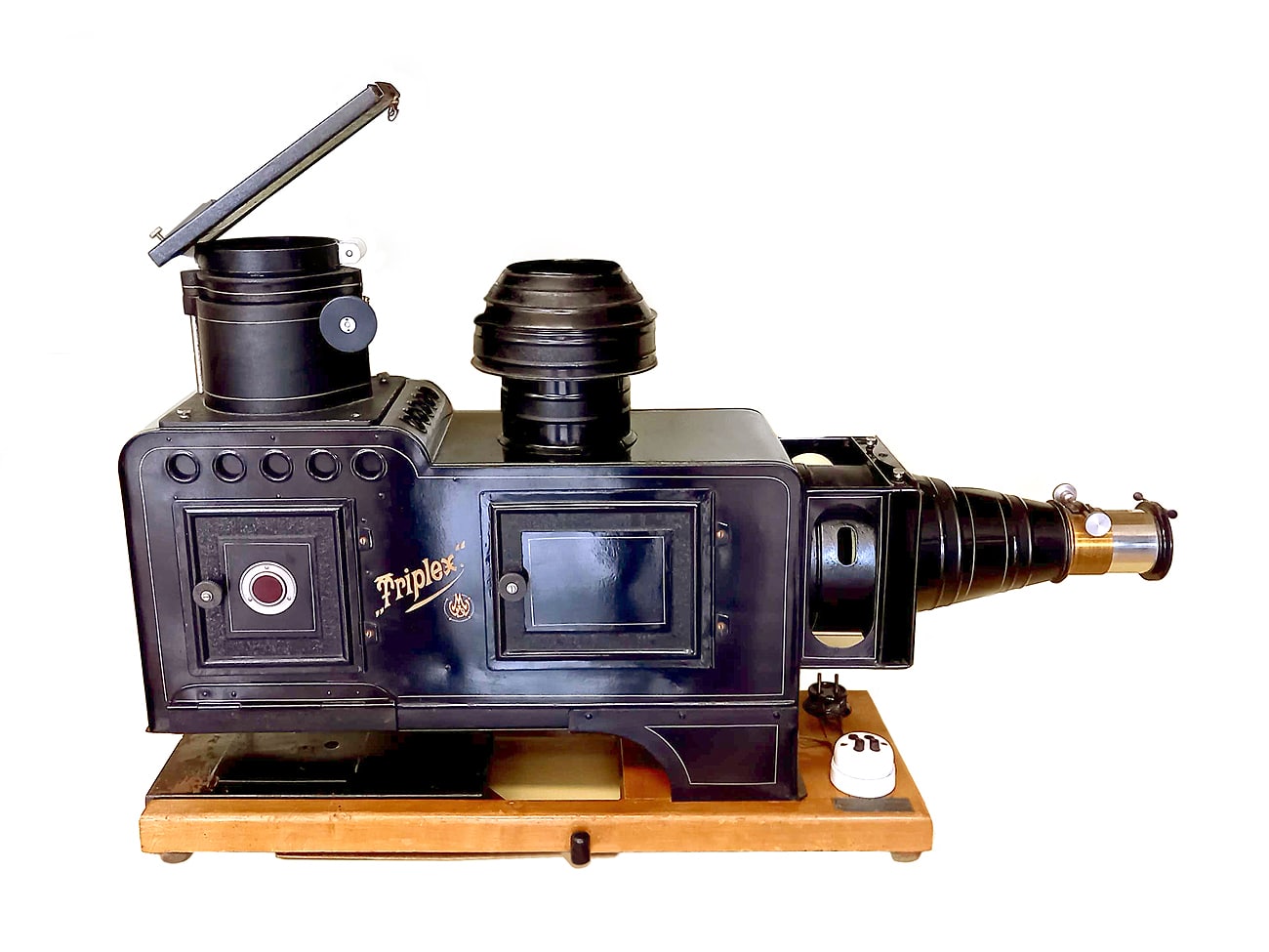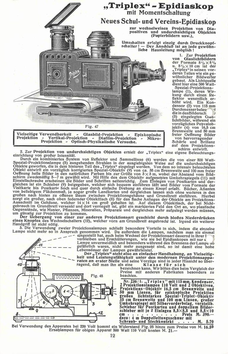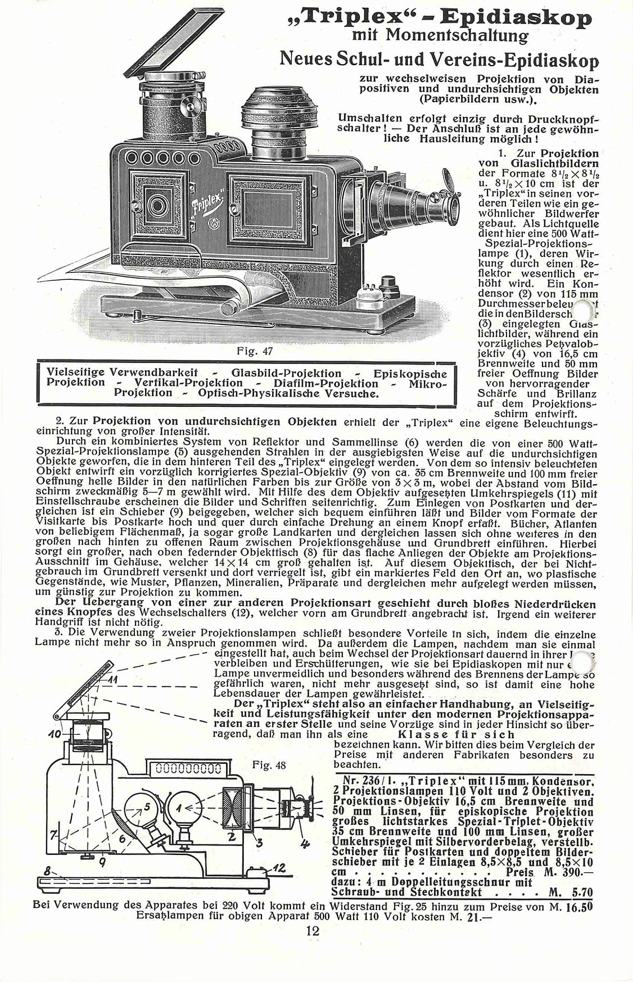 Dieses Epidiaskop namens Triplex konnte sowohl für die Projektion von Bildern und Texten als auch für die Projektion von Dias auf eine Leinwand benutzt werden. Das Gerät steht auf einem Holzrahmen. Seitlich an dem Gehäuse sind zwei Türen angebracht, von denen eine mittig eine kleine runde Glasscheibe zur Kontrolle der zwei im Inneren angebrachten Glühbirnen besitzen. Mit zwei separaten Schaltern können sie wechselweise eingeschaltet werden. Die Glühbirnen sowie die dazugehörigen Hohlspiegel sind verstellbar. Oben auf dem Projektor ist vorn ein Luftkamin zum Entweichen der durch die Glühbirnen entstehenden Wärme angebracht.
