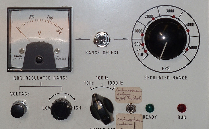 Funktionsprinzip: Der Film läuft nicht ruckhaft wie bei einer normalen Kamera an der Optik vorbei, wobei die Filmbilder jeweils in dem kurzen Stillstand belichtet werden. Vielmehr schnurrt der Film kontinuierlich durch und ein schnell rotierendes Prisma wirft das gespiegelte Bild auf den Film. So können viel höhere Bildzahlen pro Sekunde erreicht werden. In der Bildmitte das Steuerpult, links im Bild oben das Wiedergabegerät (Projektor).