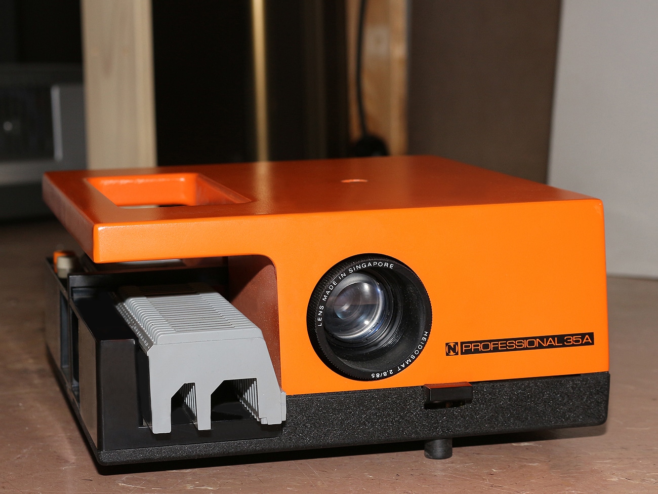 Das Versandhaus Neckermann in Frankfurt hatte selbstverständlich ebenfalls moderne Diaprojektoren im Programm. Dieser hier mit dem anspruchsvollen Namen Professional 35 A in der typischen Farbgebung der 1970er Jahre nutzte das Einheitsmagazin für 36 oder 50 Kleinbilddias 24 x 36 mm (Außenformat: 50 x 50 mm).