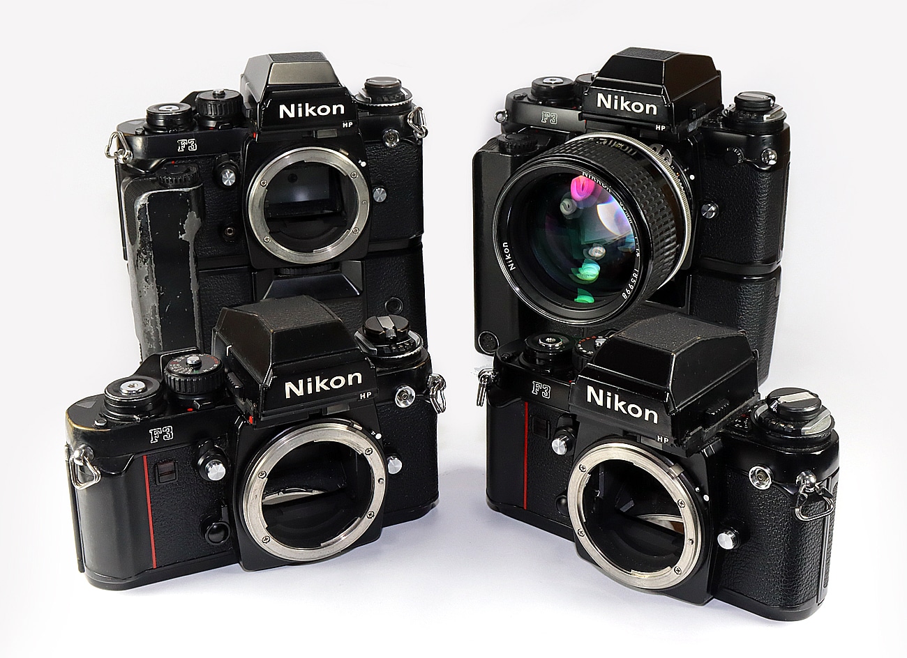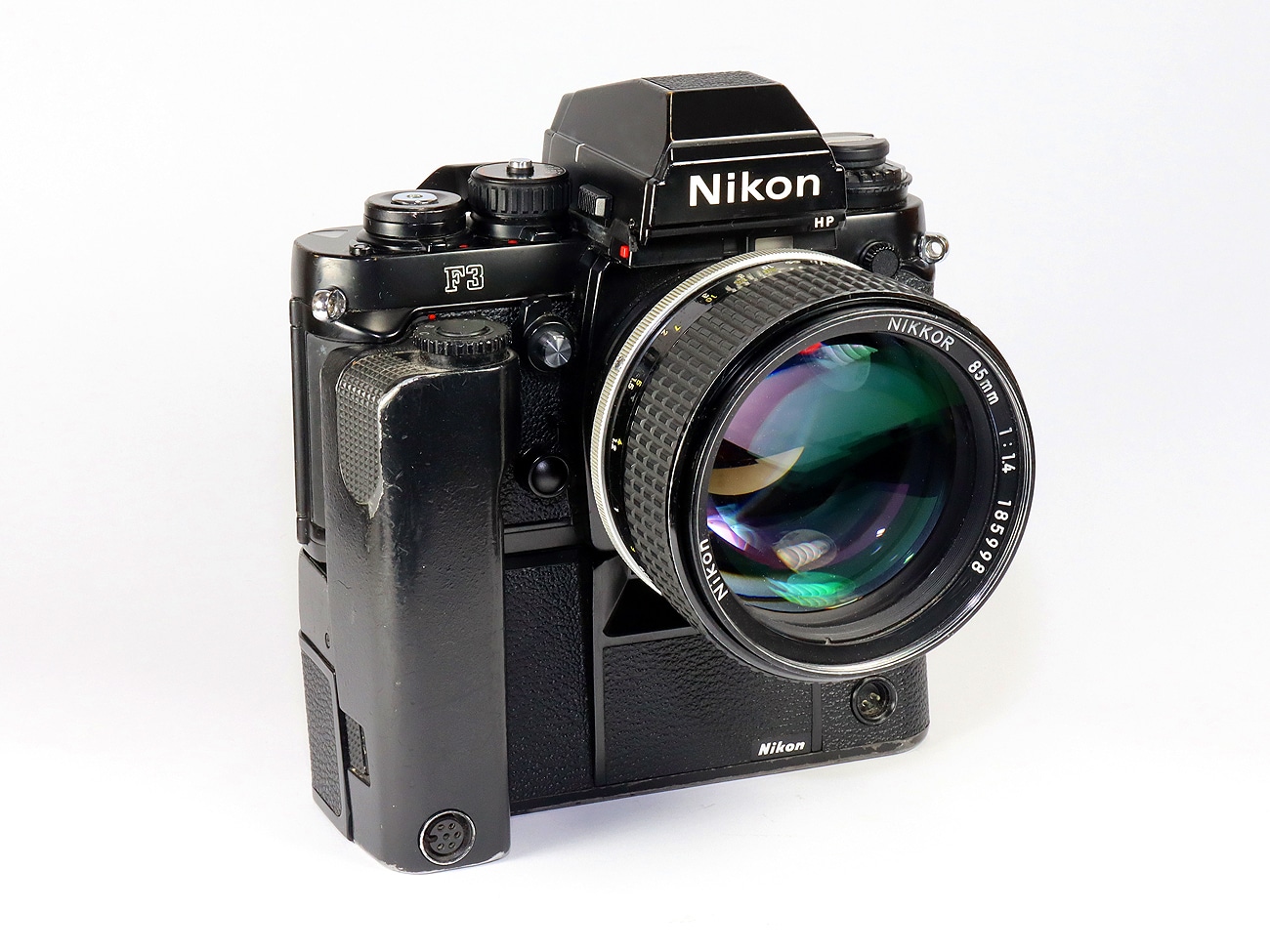 Legendäre analoge Spiegelreflex von Nikon, beliebtes Profigerät, gebaut von 1982 bis 1998, für den Kleinbildfilm 135 (Aufnahmeformat 24 x 36 mm). Wechselbarer Prismensucher mit wechselbaren Einstellscheiben. Besonderheit des Modells HP: der vergrößerte Suchereinblick, der das gesamte Sucherfeld einschließlich aller Anzeigen aus einem Augenabstand bis zu 25 mm zeigt, was besonders für Brillenträger eine Erleichterung darstellt. Sonst wie die Nikon F3: elektronischer Schlitzverschluss (schnellste Verschlusszeit: 1/2.000 Sekunde). Mittenbetonte Belichtungsmessung, manuelle Belichtungssteuerung und Zeitautomatik. Manuelle Schärfeeinstellung. Objektivanschluss: Nikon AI-Bajonett (hier mit dem extrem lichtstarken Nikkor 1:1,4/85 mm. Mit dem Motor MD-4 (im Bild mit angesetztem Bildfrequenzwandler) sind bis zu 6 Bilder pro Sekunde möglich.