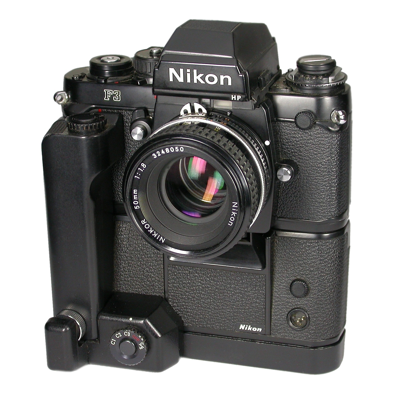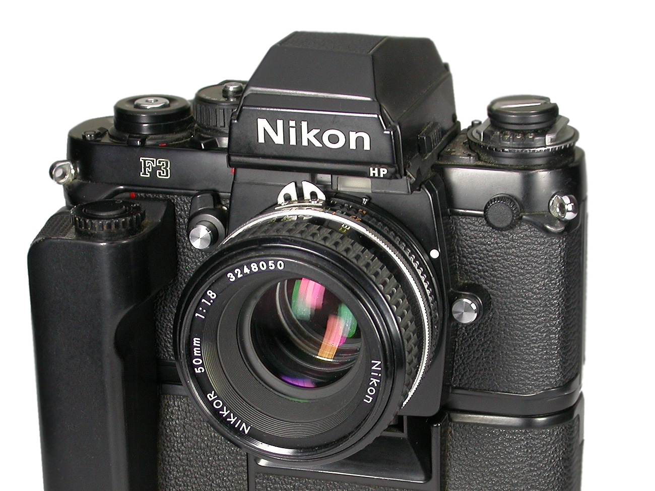 Legendäre analoge Spiegelreflex von Nikon, beliebtes Profigerät, gebaut von 1982 bis 1998, für den Kleinbildfilm 135 (Aufnahmeformat 24 x 36 mm). Wechselbarer Prismensucher mit wechselbaren Einstellscheiben. Besonderheit des Modells HP: der vergrößerte Suchereinblick, der das gesamte Sucherfeld einschließlich aller Anzeigen aus einem Augenabstand bis zu 25 mm zeigt, was besonders für Brillenträger eine Erleichterung darstellt. Sonst wie die Nikon F3: elektronischer Schlitzverschluss (schnellste Verschlusszeit: 1/2.000 Sekunde). Mittenbetonte Belichtungsmessung, manuelle Belichtungssteuerung und Zeitautomatik. Manuelle Schärfeeinstellung. Objektivanschluss: Nikon AI-Bajonett (hier mit dem Normalobjektiv Nikkor 1:1,8/50 mm, Seriennummer 3248050).