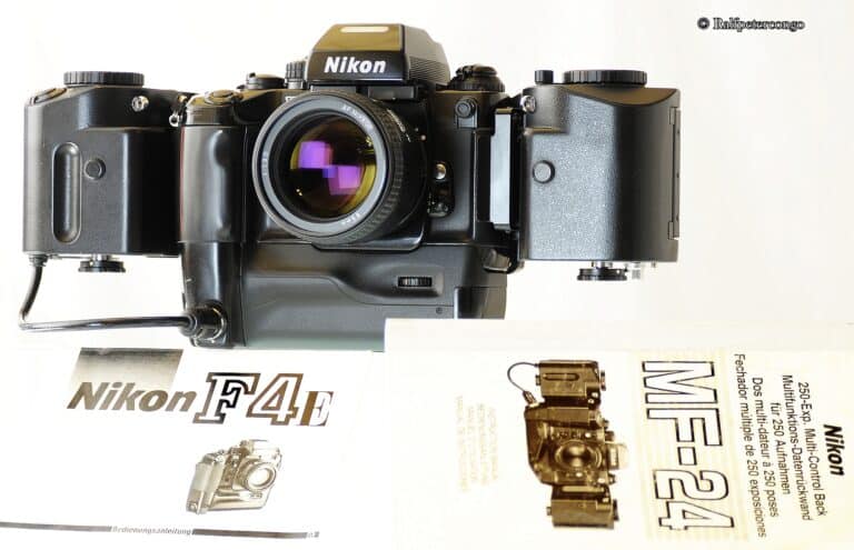 Die F4 E ist bis auf das vergrößerte Batteriefach (Handgriff MB 23 – im Bild) identisch mit der Nikon F4. Die F4 E diente auch als Basis für das 250-Bilder-Langfilmmagazin.