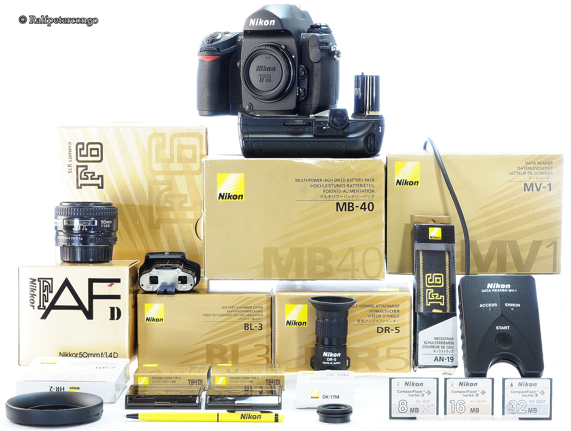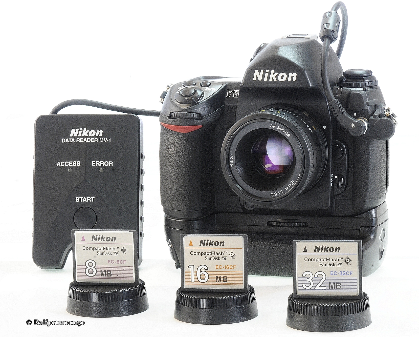 Neben dem, bei Nikon üblichen, umfangreichen Zubehör wird auch ein Datenlesegerät, MV-1, angeboten Mit diesem Datenlesegerät können die in der Kamera gespeicherten Aufnahmedaten (Full-Exif-Dateien) auf eine CF-Karte übertragen werden und anschließend auf dem PC bearbeitet werden. Das MV-1 kann auch zum Auslesen der Daten der Nikon F 5 genutzt werden. Im Gegensatz zur F 5 war die F 6 wieder schön kompakt und handlich, hatte aber nur eine Bildfrequenz von 5,5 Bilder pro Sekunde. Für eine höhere Bildfrequenz benötigt sie den Batteriegriff MB-40 mit einem Hochformatauslöser. Dadurch stieg die Rate auf 8 Bilder pro Sekunde.