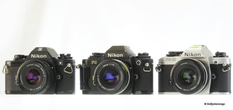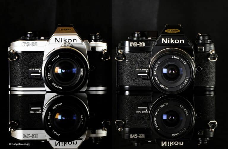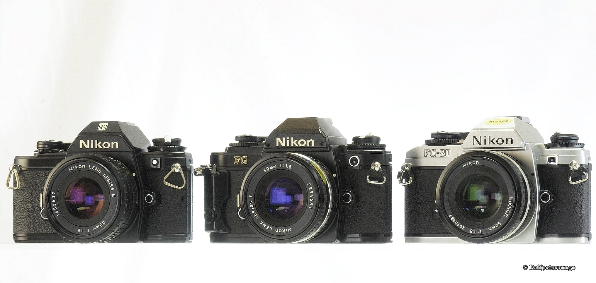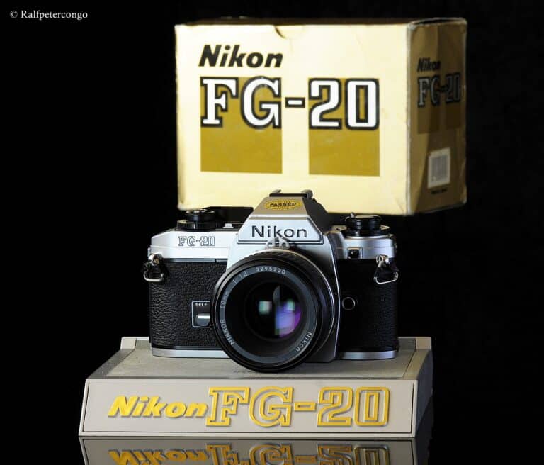 Die abschraubbare Griffleiste fehlte. Das Gehäuse wurde aus einer Kupfer-Siluminium-/Aluminiumlegierung hergestellt. Die Gehäuseoberkappe, die Bodenplatte und die Bajonettabdeckung waren aus Polycarbonat. Um das Gehäuse herum war ein Kunstlederbezug aufgeklebt. Die Nikon FG wurde in chrom und in schwarz angeboten. Das Gewicht betrug nur 440 Gramm. Das Motorenangebot blieb bei den MD-E und MD-14. Dazu gab es die Blitze SB-E und SB-14. Die Datenrückwand MF-15 konnte nicht verwendet werden. Wie die Nikon-Kaufleute auf den Namen FG-20 kamen, wissen nur sie selbst, es gibt keine nachvollziehbare Erklärung dafür. Vielleich diese: sie ist 20 Gramm leichter als die Nikon EM…