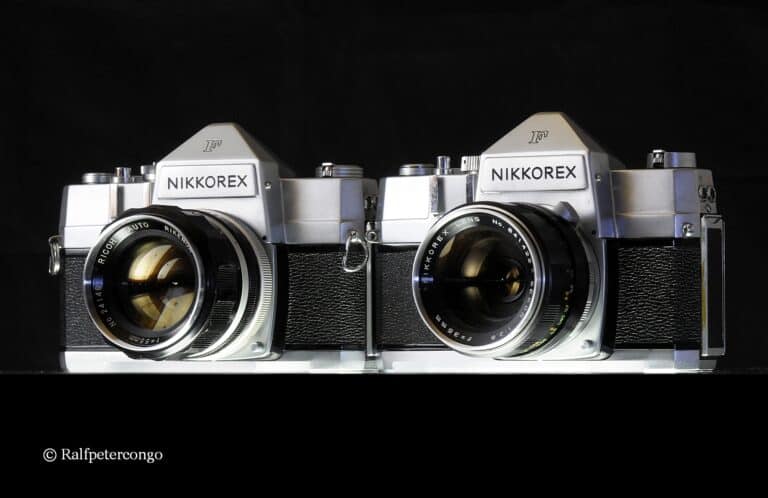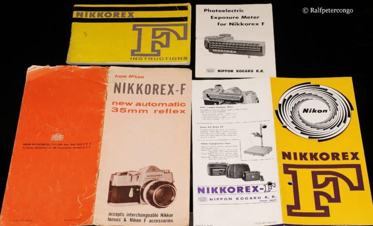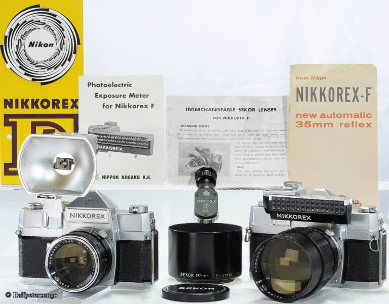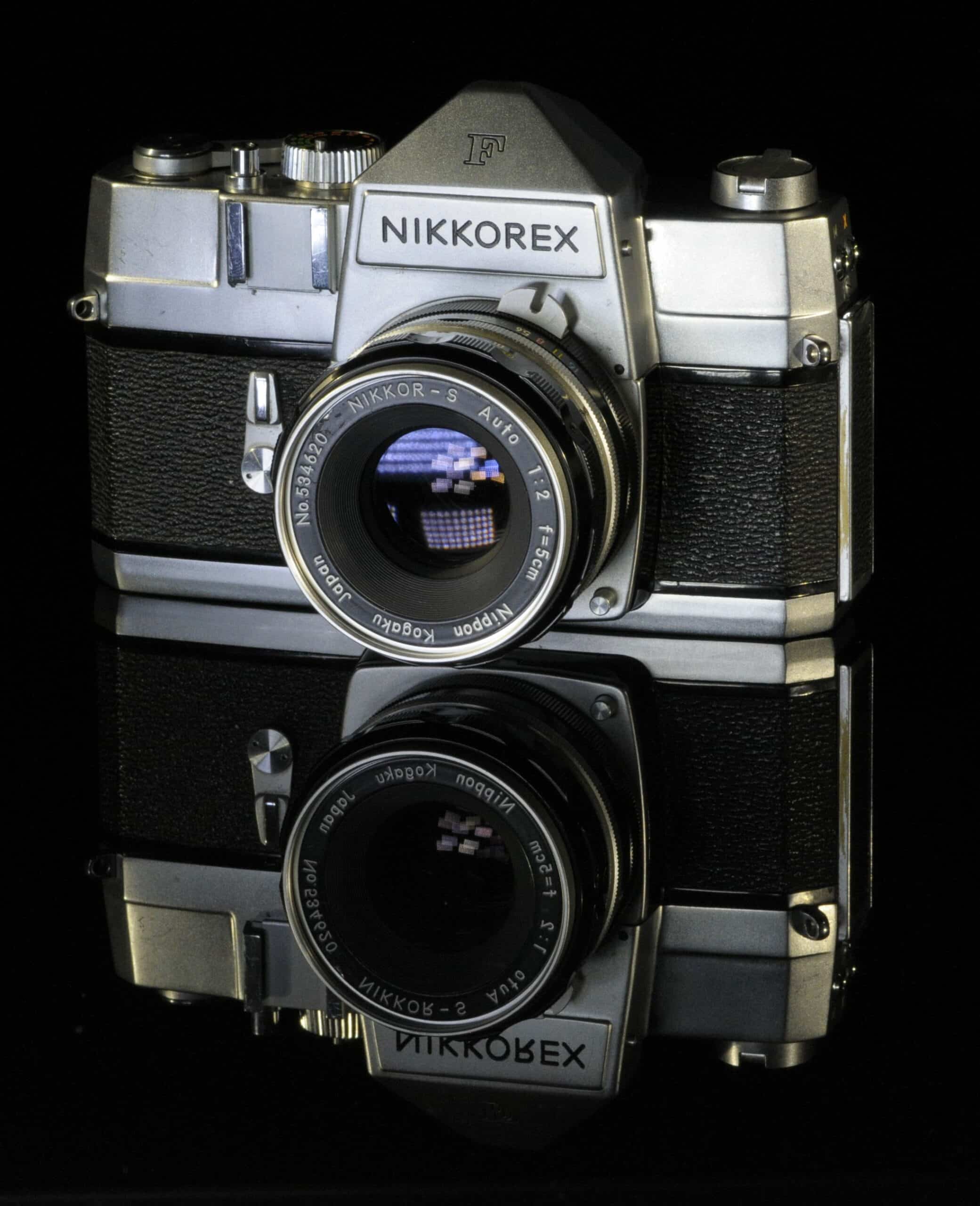 Preisgünstige Spiegelreflexkamera als günstige Alternative zur Nikon F. Die Kamera hatte ebenfalls einen Rückschwingspiegel und das Nikon-F-Bajonett. Allerdings konnte der Spiegel nicht arretiert werden. Das Kameragehäuse wurde in Zusammenarbeit mit Mamiya Koki, Tokio, entwickelt und komplett von Mamiya produziert. Erstmalig wurde in eine SLR-Kamera ein vertikal ablaufender Metalllamellenverschluss (Copal Square) eingebaut, die Zeiten waren 1 bis 1/1.000 Sekunde und B. Die Blitzsynchronisation über Kabelanschluss liegt bei 1/125 Sekunde. Im Gegensatz zur Nikon F besaß die Nikkorex F einen fest eingebauten Prismensucher und keinerlei Möglichkeiten, einen Motor oder ein Langfilm-Magazin anzubauen. Ein zusätzlicher Selen-Belichtungsmesser konnte von oben aufgesteckt und mechanisch mit dem Zeitenrad verbunden werden. An der Kamerarückwand befand sich eine Filmmerkscheibe von 10 bis 800 ASA. Diese Kamera wurde von 1962 bis 1966 in zirka 60.000 Stück gebaut. Das Gewicht betrug 770 Gramm. Für den deutschen Markt wurde diese Kamera unter der Bezeichnung Nikkor J, analog zu den in Deutschland angebotenen Nikon F als Nikkor F, verkauft. Am Ende der Produktionszeit (1965-1966) gab es eine leicht abgespeckte Version ohne Filmmerkscheibe und mit vereinfachten Bedienelementen. Standardmäßig wurden diese Kameras mit einem Objektiv 1:2 mit 50 mm Brennweite angeboten. Unser Bild: Zweimal Nikkorex F mit verschiedenen Objektiven.