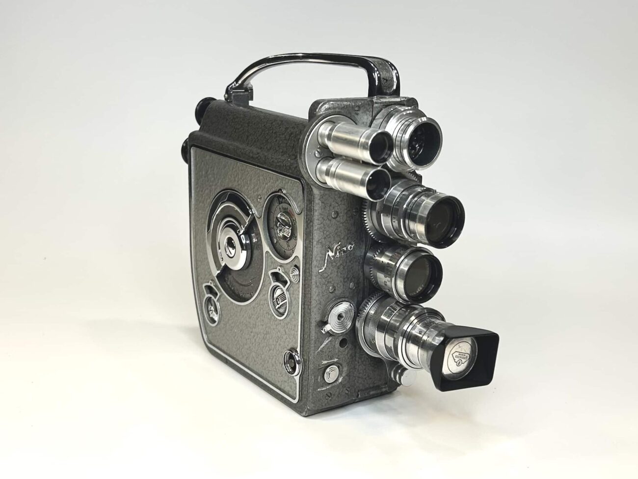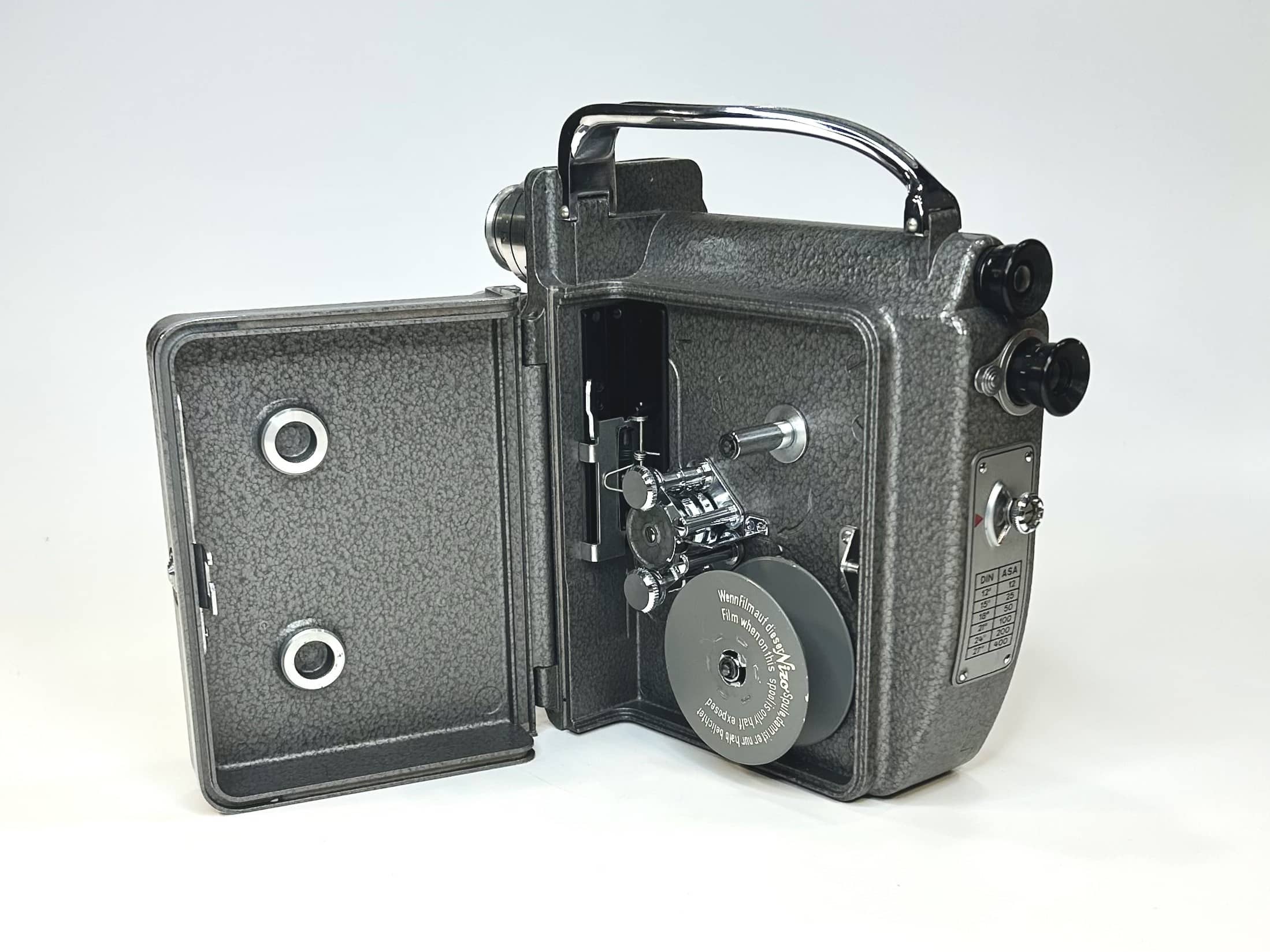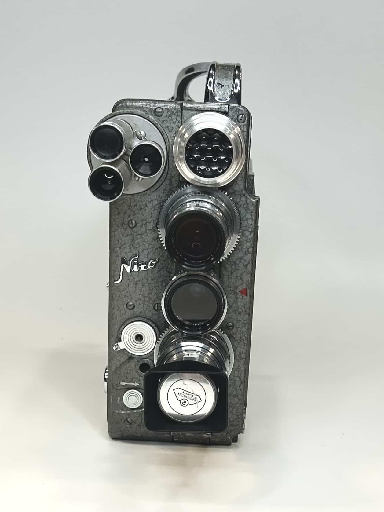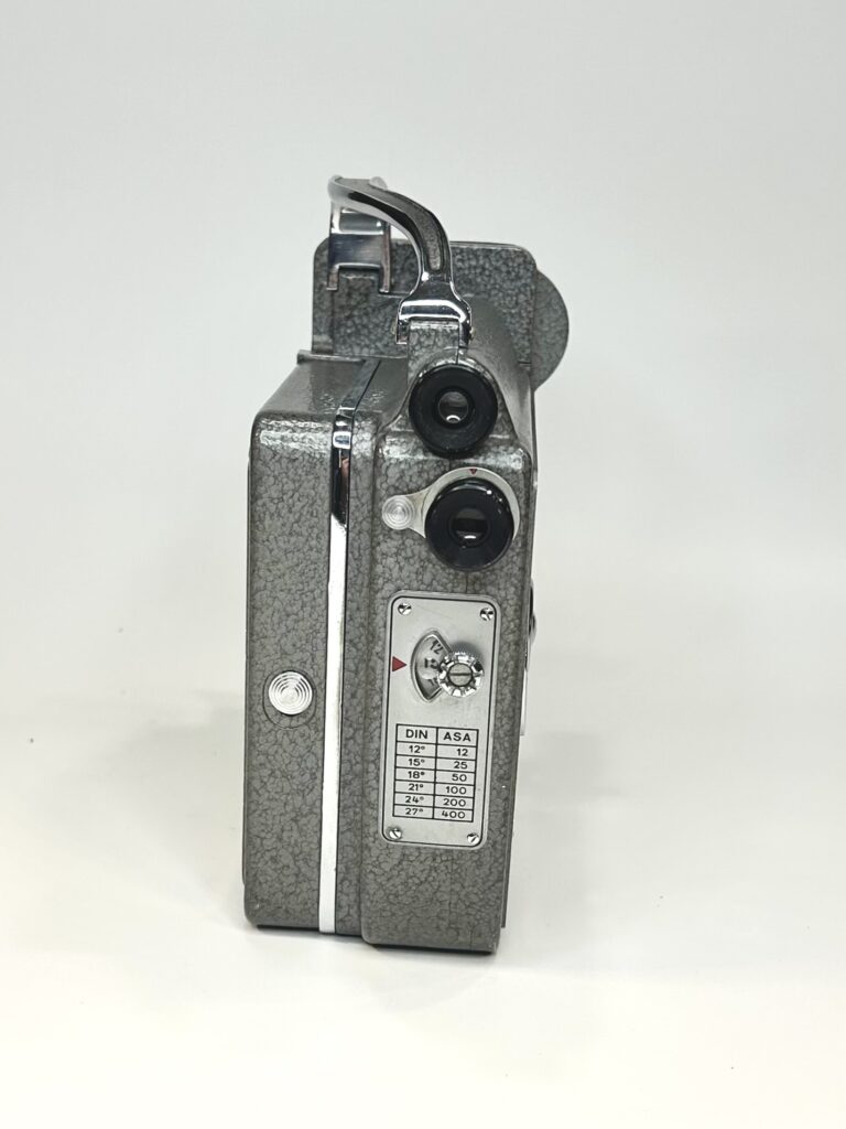 Das Gehäuse besteht aus Aluminiumguss mit einer grauen Hammerschlaglackierung. Mit ihren Maßen von etwa 17 × 6,8 × 19,5 cm und einem Gewicht von rund 1,8 kg liegt sie solide in der Hand. Die Nizo Heliomatic 8 Reflex war eine Kamera für anspruchsvolle Amateure, die Wert auf Flexibilität, Präzision und ein hohes Maß an Bedienkomfort legten.