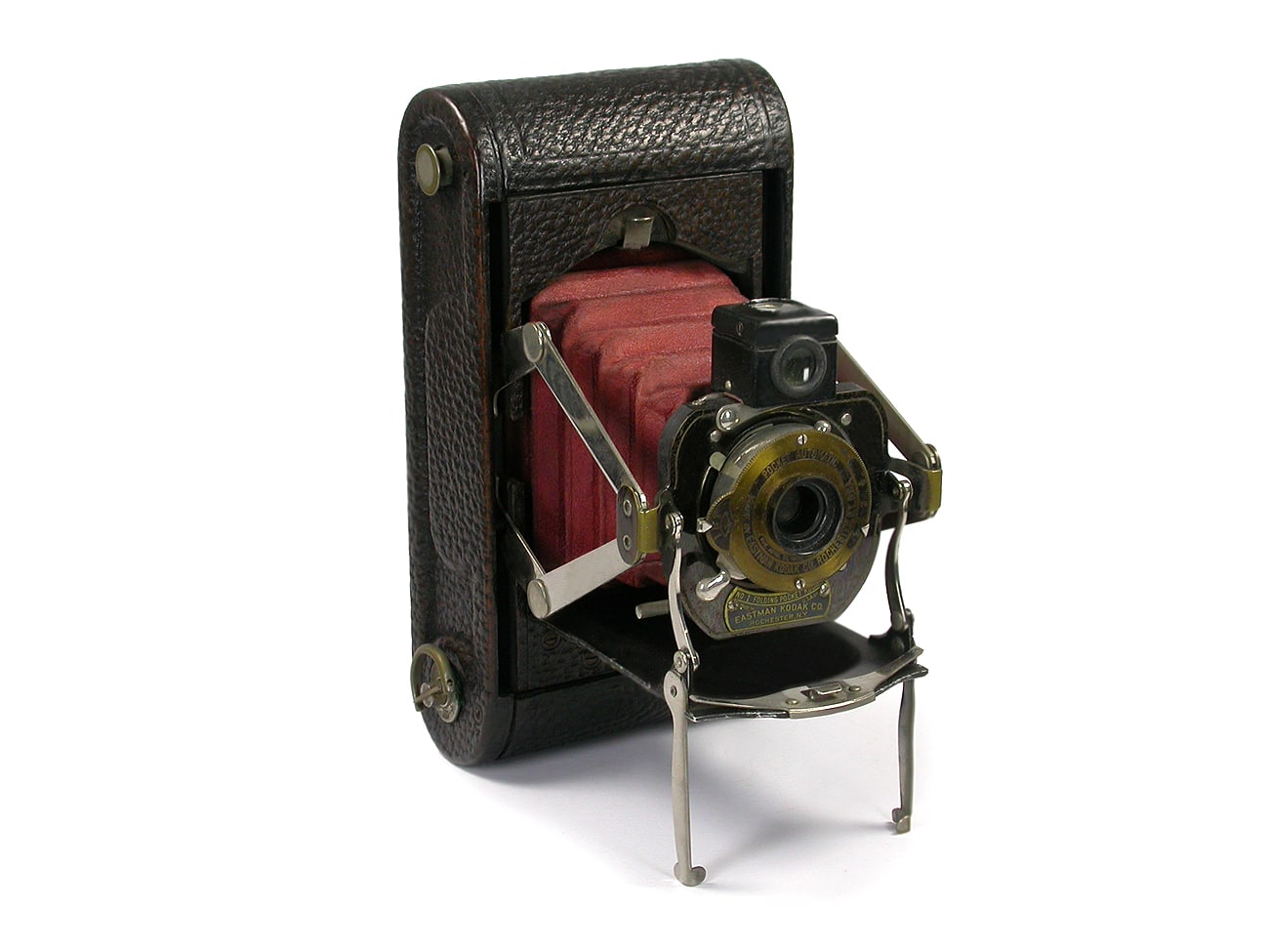 Klapp-/Spreizenkamera (1909-1915, USA) für den Rollfilm 105 (Negativformat 6 x 9 cm). Klappbarer Brillantsucher. Bis 1911 hatten sämtliche Kameras rote Lederbalgen, die Kameras für England danach schwarze Balgen. Ab 1912 hatten alle Kameras der verschiedenen Baureihen schwarze Balgen. Es dürfte sich hier wahrscheinlich um das Modell E handeln.