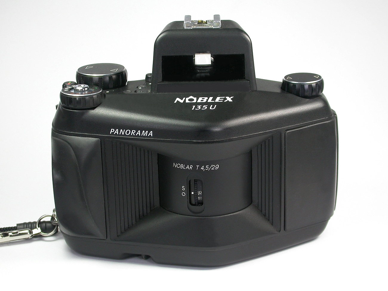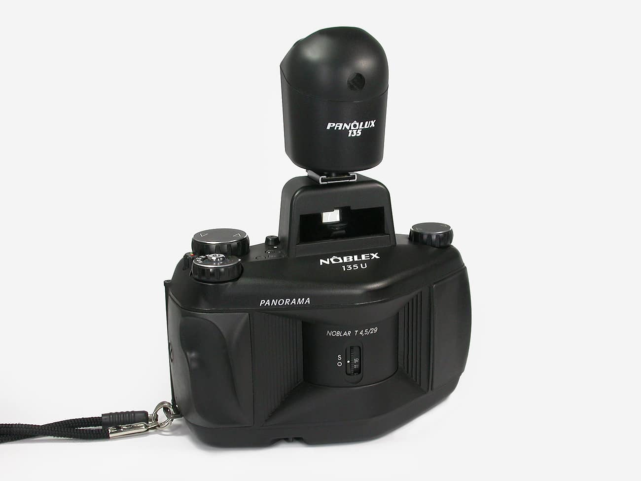 Begehrte und seltene analoge Panorama-Kamera für den klassischen Kleinbildfilm 135, made in Dresden (1994 bis 2003), Aufnahmeformat: 24 x 65 mm, Genutzter Bildkreisdurchmesser: 32 mm. Shiftmöglichkeit nach oben/unten: 4 mm. Bildwinkel über die Diagonale: 135 Grad, Bildwinkel horizontal: 127 Grad. Belichtungszeiten: 1/500 bis 1 Sekunde. Verschluss: Rotierender Spalt mit 1,4 mm Breite. Mehrfachbelichtungen möglich. Manuelle Belichtungssteuerung sowie automatische Belichtungsmessung und -steuerung mit Zubehör Panolux 135. Objektiv: Noblar T 1:4,5/29 mm. Fixfokus-Einstellung. Blenden: 4,5 bis 16. Eingebaute Wasserwaage. Stativanschluss: 1/4 Zoll. Batterie: 4 x 1,5-Volt AAA. Gewicht: 790 Gramm.