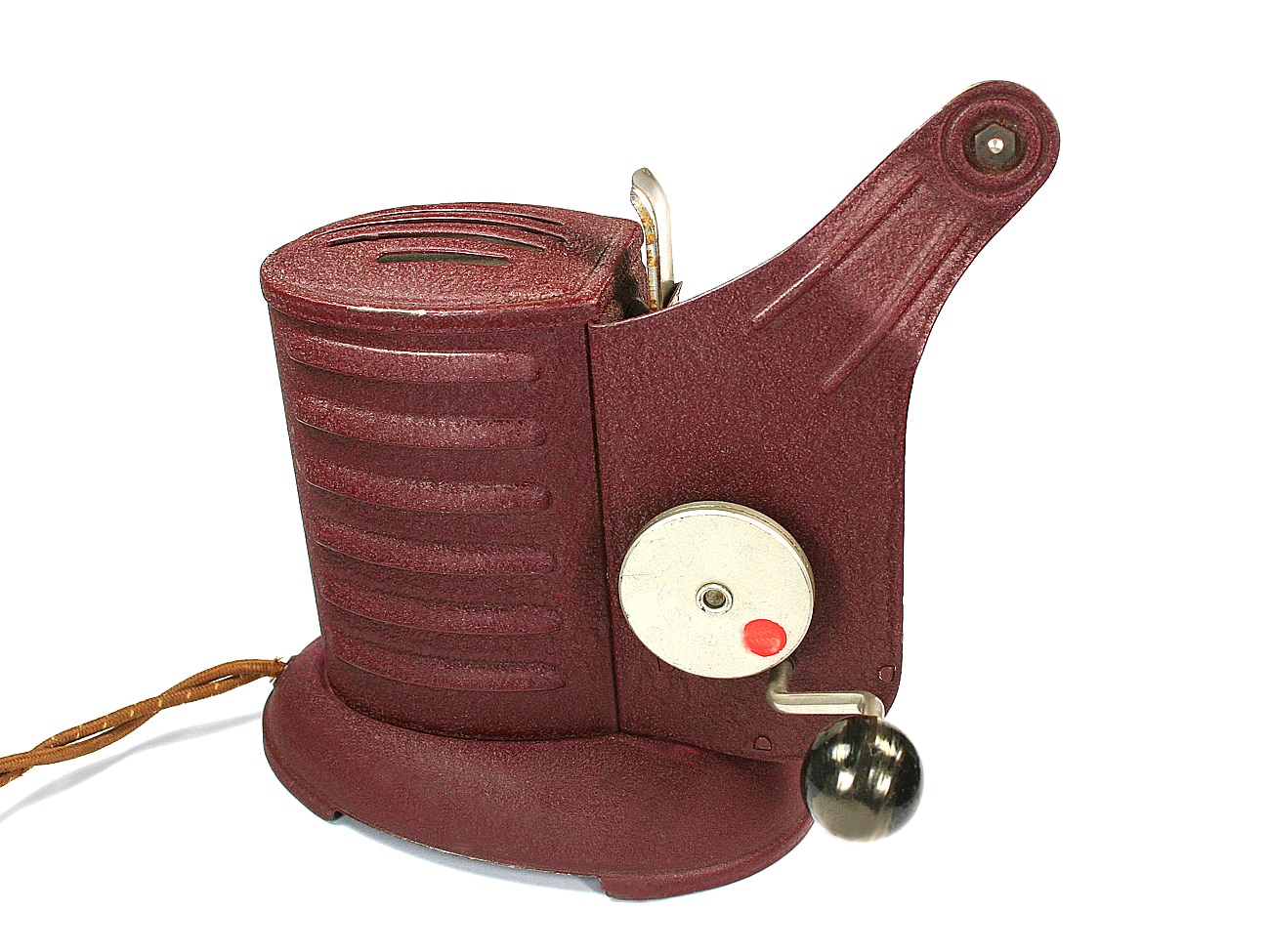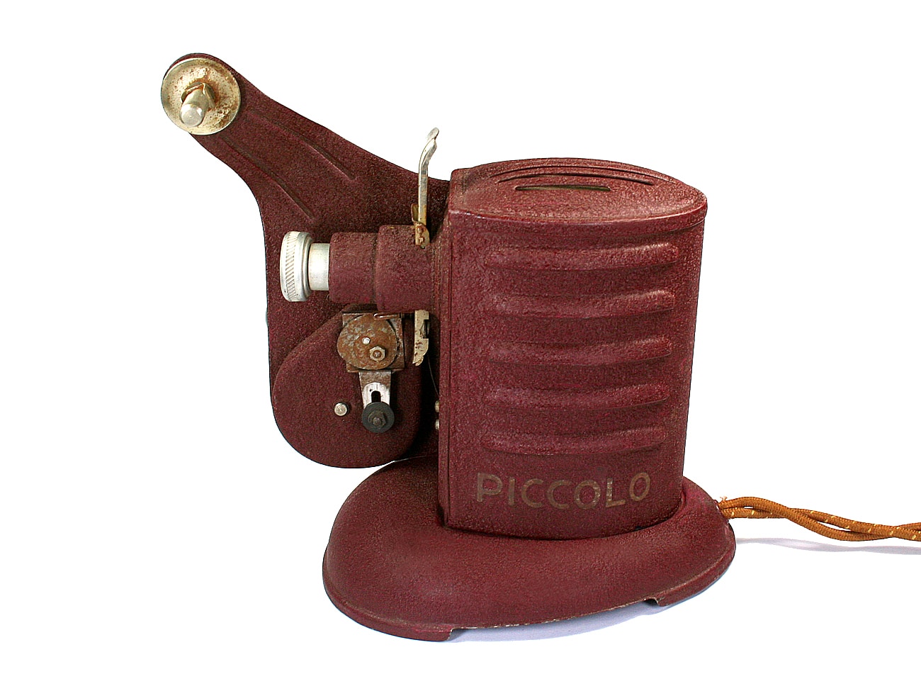 Kinderprojektor für 16-mm-Kurzfilme wie zum Beispiel von Ozaphan; Deutschland, Dreißiger Jahre, Plank (Noris), Nürnberg. Bei dieser einfachsten Ausführung (Nr. 1) gab es tatsächlich nur einen Spulenarm (oben). Der Film landete nach dem Passieren des Strahlengangs einfach auf dem Tisch oder auf dem Boden und musste dann per Hand wieder auf die ursprüngliche Spule aufgerollt werden. Die Ausführungen Nr. 2 und Nr. 3 hatten dann auch eine Aufwickelspule. Der Filmtransport erfolgt per Handkurbel jedoch ohne Zahntrommeln im Zulauf und im Ablauf, ein Zweizackengreifer mit Reuleaux-Antrieb sorgt für die Bild-Weiterschaltung. Die Lampe, eine gewöhnliche „Haushaltsbirne“ (Prospekt), wird direkt mit 220 Volt Netzspannung versorgt. Für die Rückspulung stand ein separates Kurbelgerät zur Verfügung. Auch andere Farben (grau, hellblau) waren verfügbar.