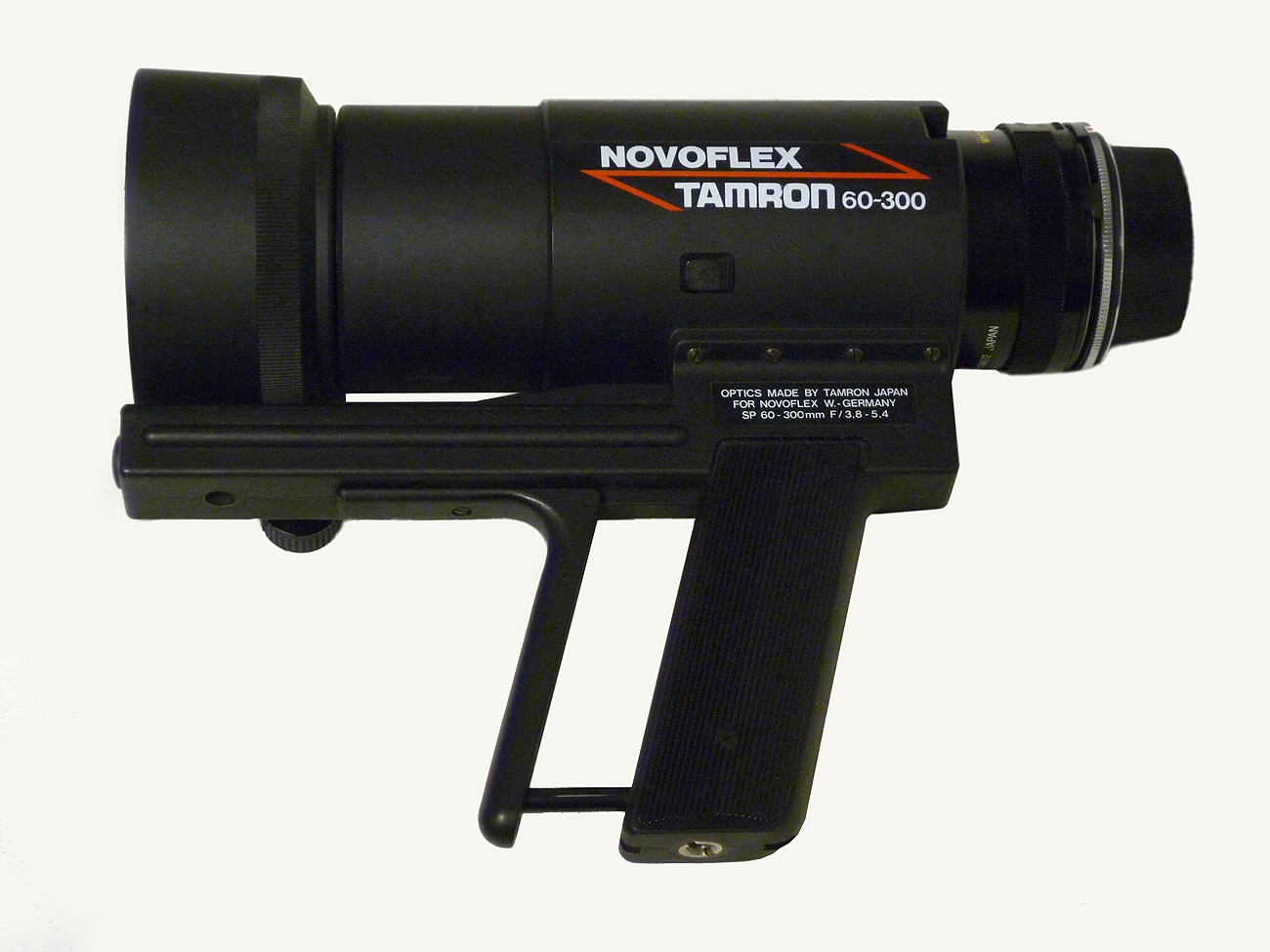 Seltenes Objektiv aus gutem Hause: Ein Novoflex-Schnellschussobjektiv, 1986, mit einer Zoom-Optik von Tamron. Daten: 1:3,8-5,4/60-300 mm, Makromodus mit Abbildungsmaßstab 1:1,55. Entfernungseinstellung: 1,9 Meter bis unendlich. Gewicht: 1,5 kg. Anschluss: Tamron Adaptall-2-System, hier mit dem Anschluss für Minolta MD. Damaliger Preis: 1.475 DM (1989). Im Museum komplett mit dem speziellen Tragekoffer.