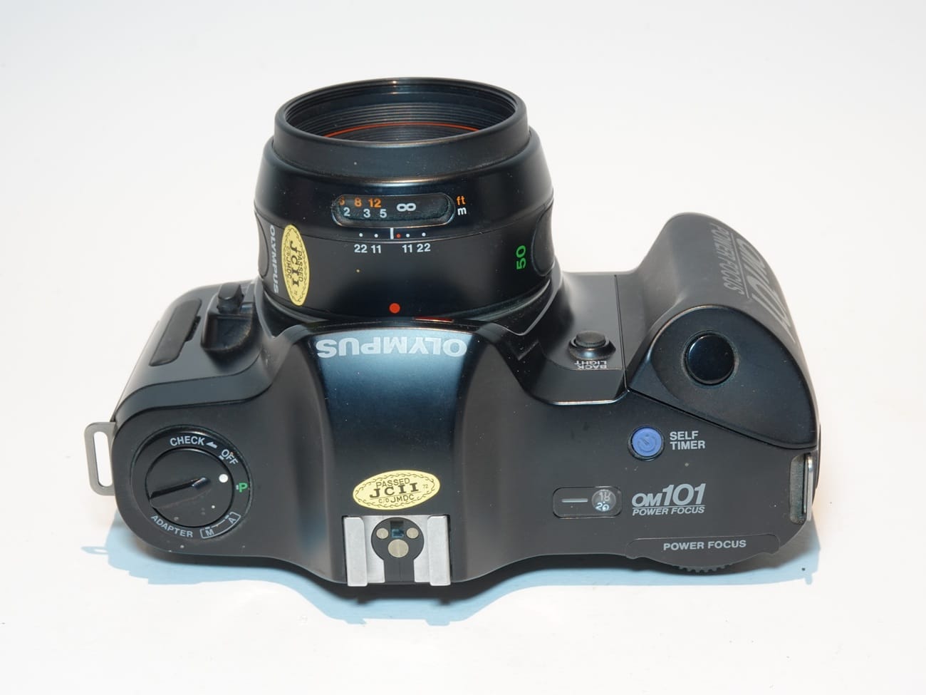 Einäugige Spiegelreflexkamera (SLR) für den Kleinbildfilm 135 (Aufnahmeformat 24 x 36 mm), hergestellt in Japan ab 1987. Für für AF- und PF-Wechselobjektive mit Olympus OM-Bajonett, hier mit Olympus Lens 1:2,0/50 mm, Seriennummer 111659; manuelle Fokussierung mittels Power Focus. Die Scharfstellung erfolgt über ein Rändelrad hinten am Gehäuse und wird elektromotorisch auf das Objektiv übertragen. Prismensucher. Elektronisch gesteuerter, vertikal ablaufender Metalllamellenschlitzverschluss (2 Sekunden bis 1/2.000 Sekunde; Selbstauslöser). Mittenbetonte, integrale TTL-Belichtungsmessung; Programmautomatik mit Arbeitsbereich LW 1 bis LW 20; Taste für Gegenlichtkorrektur, manuelle Belichtungssteuerung möglich. Filmempfindlichkeitsbereich: ISO 25/15° bis ISO 3200/36°. Blitzlichtmessung: TTL-Messung in der Filmebene, Synchronzeit 1/80 Sekunde. Motorischer Filmtransport, automatisch zum ersten Bild, dann nach manueller Auslösung; motorische Rückspulung. Austauschbare Rückwand. Im Museum mit der Originalverpackung. Stromversorgung: 4 x Batterien AAA.