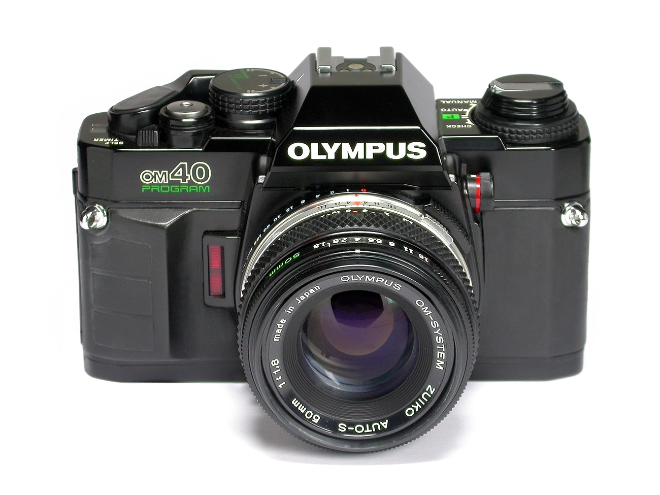Eine kompakte einäugige Spiegelreflexkamera (SLR) für den Kleinbildfilm 135 (Aufnahmeformat 24 x 36 mm), hergestellt in Japan ab 1985. Für Wechselobjektive (Olympus-Bajonett), hier mit einem Olympus-Objektiv Zuiko Auto-S, 1:1,8/50 mm. Prismensucher. Elektronisch gesteuerter, horizontal ablaufender Tuchschlitzverschluss (B, 1 bis 1/1.000 Sekunde; elektronischer Selbstauslöser). TTL-Belichtungsmessung (mittenbetont oder selektive Feldmessung; Messelement: Silizium-Fotodioden). Belichtungssteuerung manuell oder automatisch (Zeitautomatik, Programmautomatik). Schnellschalthebel, Motoranschluss in der Bodenplatte.