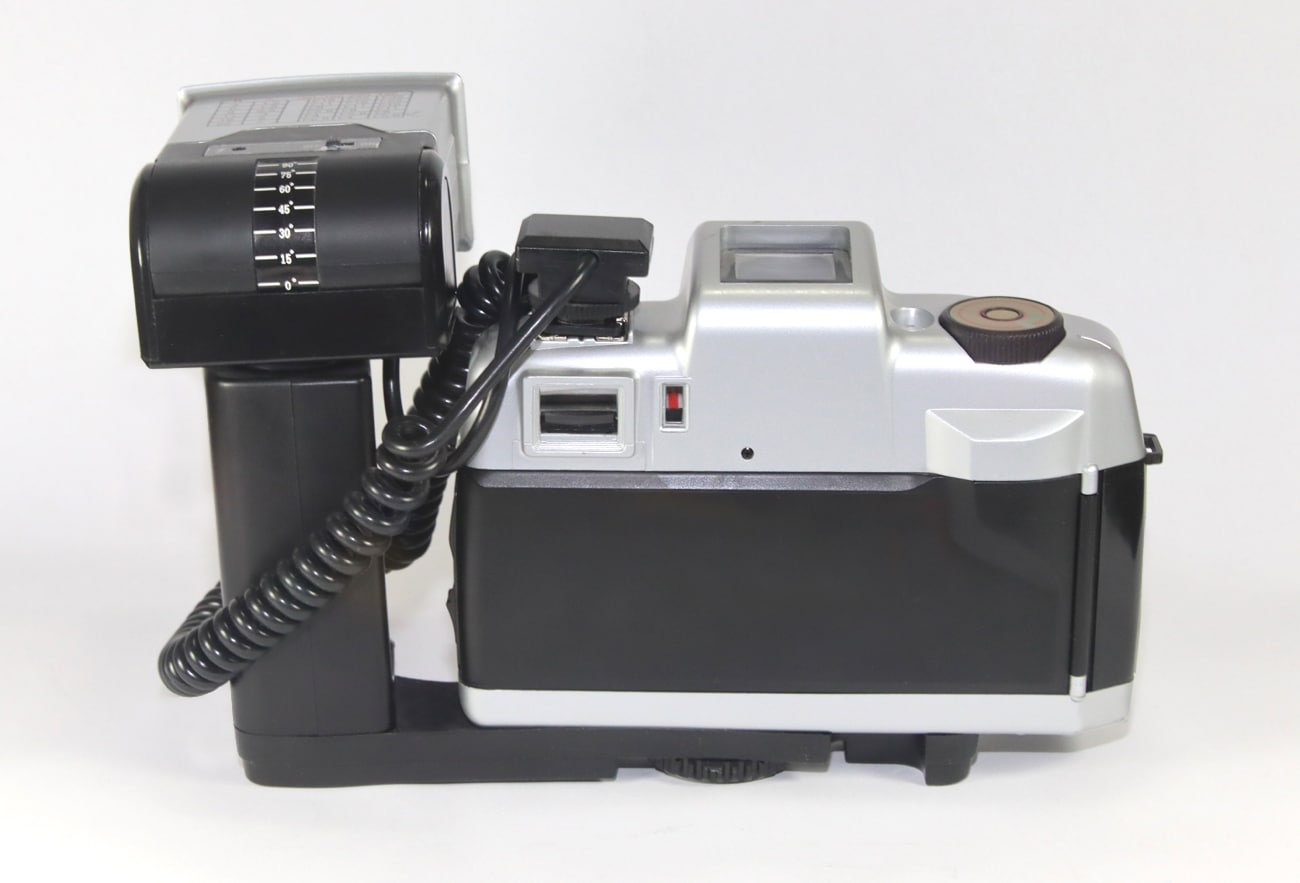 Dazu gehört ein hochmoderner E-Blitz, dessen Gehäuse so schlampig zusammengeschustert wurde, dass man mit ein wenig Pech auch schon mal mit der Elektrik der Hochvoltblitze in Berührung kommen kann: Bei hochgeklapptem Reflektor öffnet sich eine ziemlich große Öffnung im Gehäuse, die den Blick auf eine gedruckte Leiterplatte freigibt. Dieses Trumm hat kein TÜV jemals gesehen, geschweige denn abgesegnet.