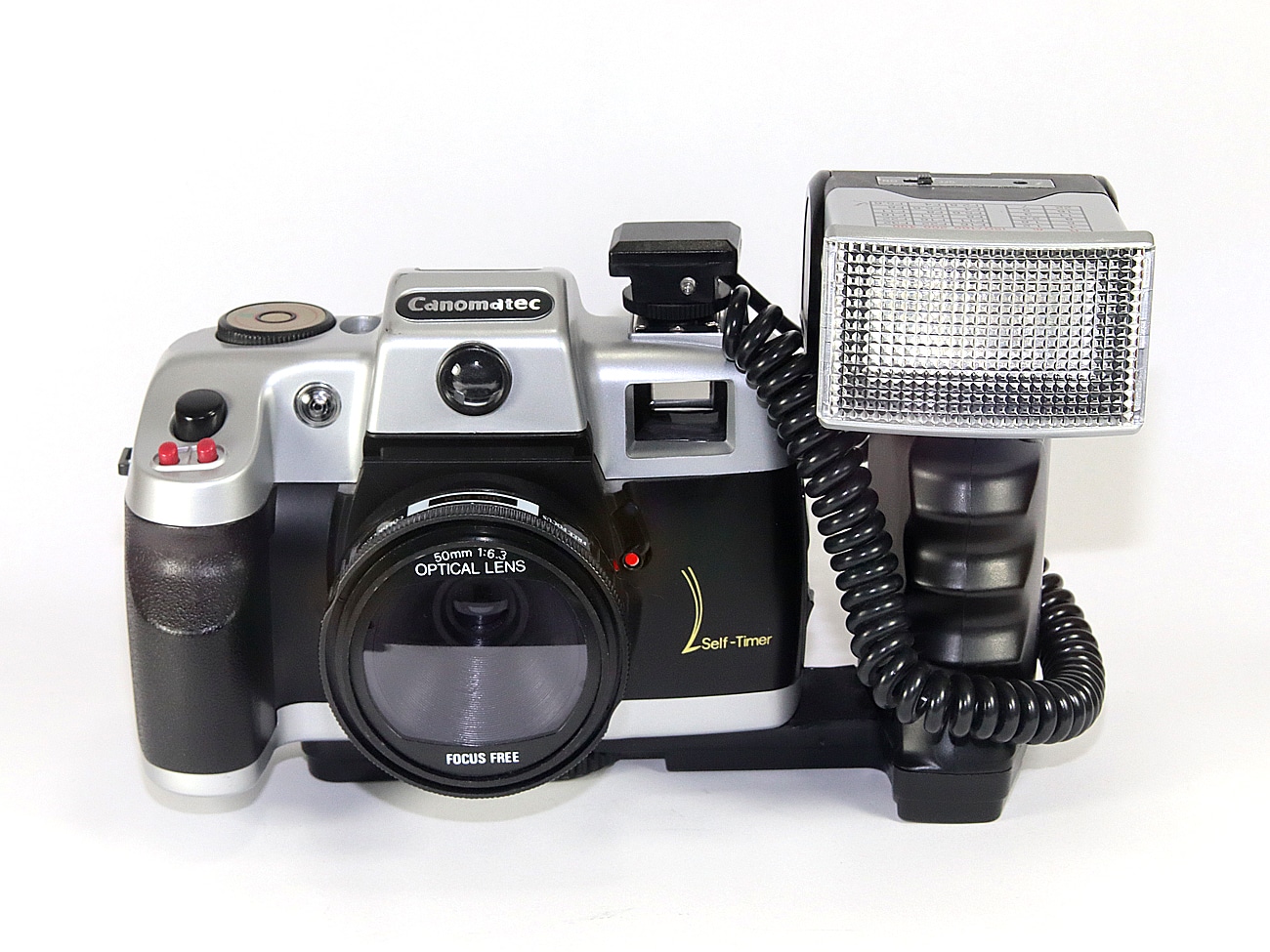 Auch so eine Version der Canomatics, nur heißt die Kamera diesmal leicht abgewandelt „Canomatec“: Null Optik (nur ein paar Kunststofflinsen), null Elektronik (außer dem Selbstauslöser), null Komfort (außer dem motorischen Filmtransport). Ein Modell von vielen, gebaut zum Posen, weniger zum Fotografieren. Technisch eine Kleinbildkamera für das Negativformat 24 x 36 mm. Durchsichts- und „Winkelsucher“ (hinter der Schrift oben) wie bei den Schwestermodellen, etwa der Canomatic FMD, der Globus oder der Odette. Die „Optical Lens“ soll eine Lichtstärke von 1:6,3 aufweisen sowie eine Brennweite von 50 mm.