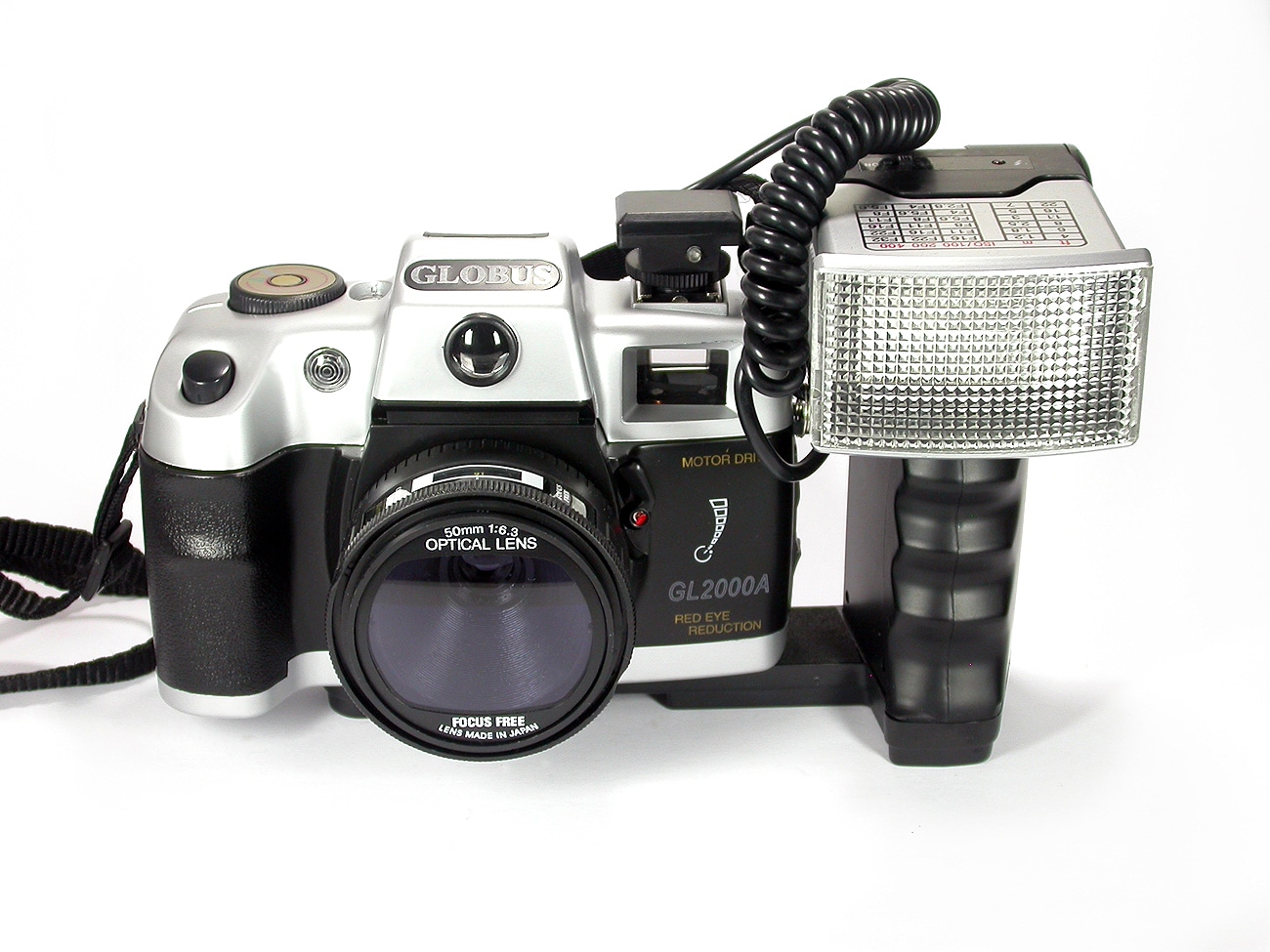 Auch so eine Version der Canomatics: Null Optik (nur ein paar Kunststofflinsen), null Elektronik (außer dem Selbstauslöser), null Komfort (außer dem motorischen Filmtransport). Ein Modell von vielen, gebaut zum Posen, weniger zum Fotografieren. Technisch eine Kleinbildkamera für das Negativformat 24 x 36 mm. Durchsichts- und „Winkelsucher“ (hinter der Schrift oben) wie bei den Schwestermodellen, etwa der Canomatic FMD, der Nokina oder der Odette. Die „Optical Lens“ soll eine Lichtstärke von 1:6,3 aufweisen sowie eine Brennweite von 50 mm. Wie das mit der „Rote Augen-Reduktion“ funktionieren soll, bleibt ein Rätsel. Dazu gehört ein hochmoderner E-Blitz sowie üblicherweise eine Tasche.