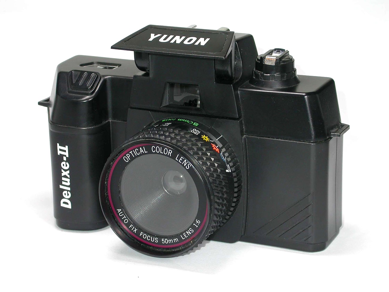 Eine „Kamera“ für Kleinbildfilm 135, die in die Canomatic-Familie passt wie die Faust aufs Auge: Plastikgehäuse, gewölbte Filmbühne, Kunststoff- „Frontlinse“, keine Spiegelreflex, sondern Durchsichtssucher (hinter der aufklappbaren, mit „YUNON“ beschrifteten Blende am Pseudo-Prisma), eingebautes Bleigewicht, Filmtransport per Rändelrad auf der Rückseite… Und das so genannte Objektiv ist natürlich auch – was immer das sein soll – ein „Auto Fix Focus 50 mm Lens 1:6“ wie die anderen einschlägig bekannten Plastik-Bomber. Immerhin gibt es zwei Symboleinstellungen (für 100 und 200 ISO Filmempfindlichkeit) beziehungsweise vier Blendensymbole von „Sonne“ bis „Bewölkt“.