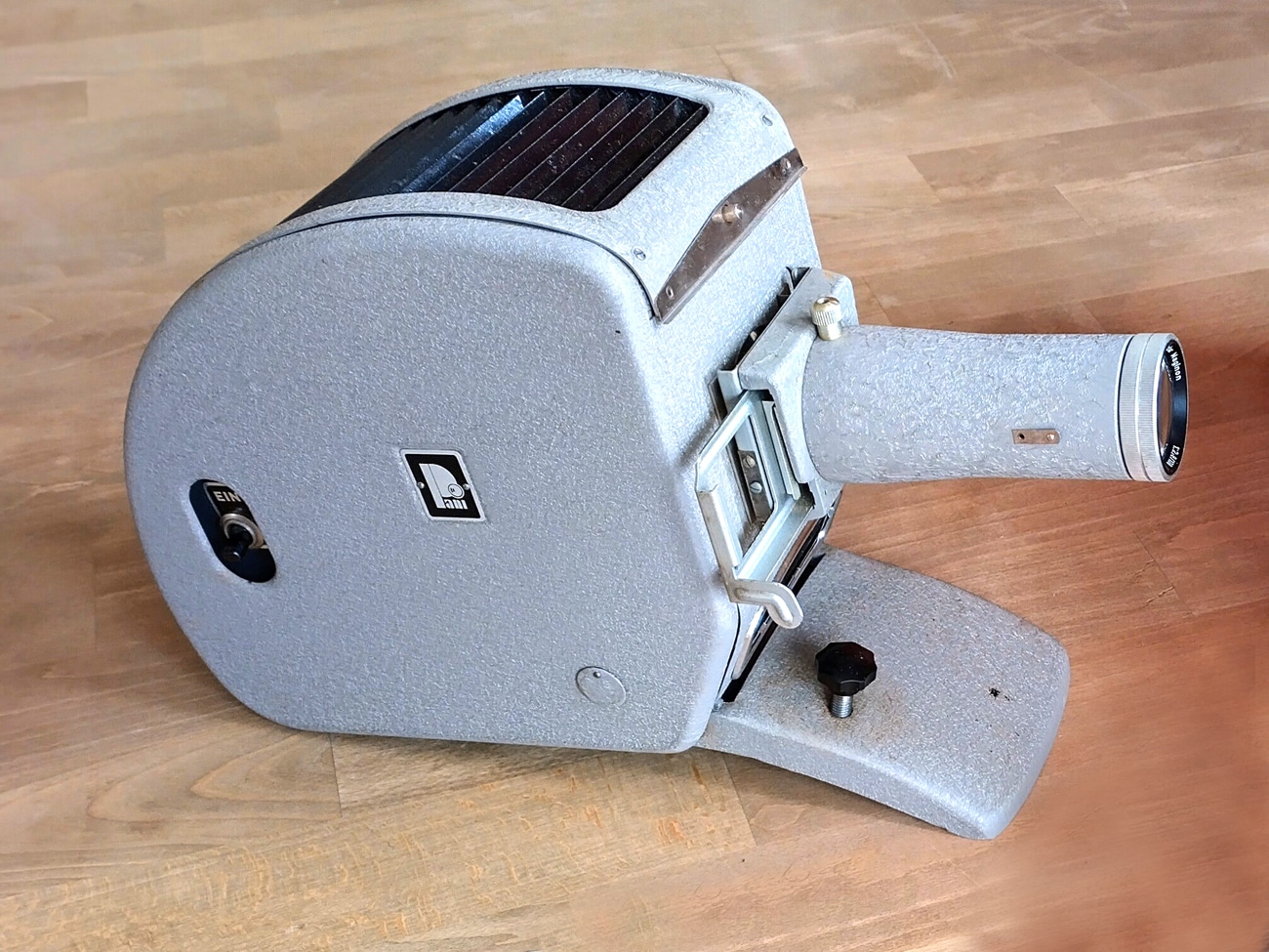 Der hier gezeigte Diaprojektor Pani Pantax aus den 1950er Jahren ist für Kleinbildias mit den Außenabmessungen 5 x 5 cm geeignet, mit entsprechendem Zubehör auch für die „Projektion von Bildbandstreifen in den Formaten 18 x 24 mm und 24 x 36 mm sowie von mikroskopischen Übersichtsbildern und optisch-physikalischen Versuchen“, wie die Bedienungsanleitung vermerkt.