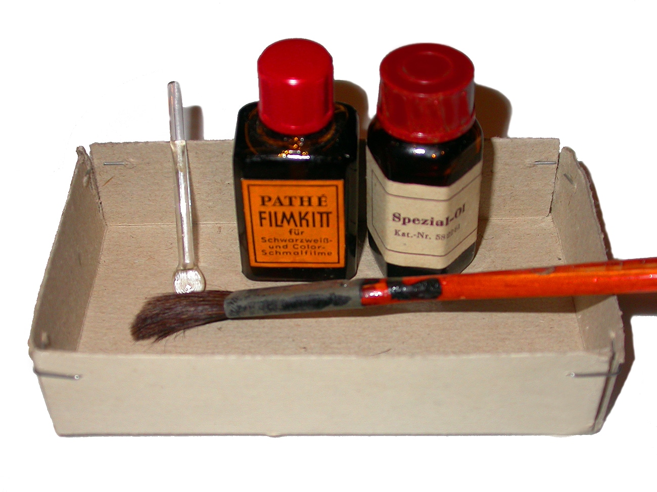 Alte Chemikalien aus den 1960er Jahren: „Pathé-Filmkitt für Schwarzweiß- und Color-Schmalfilme“ und „Spezial-Öl“.