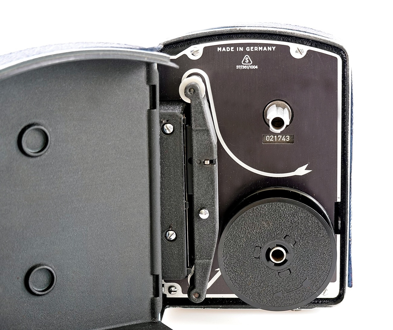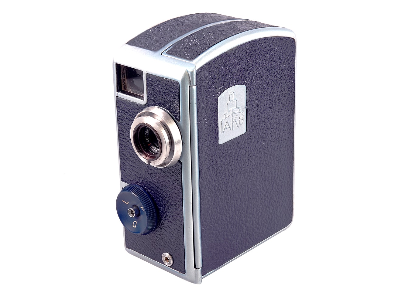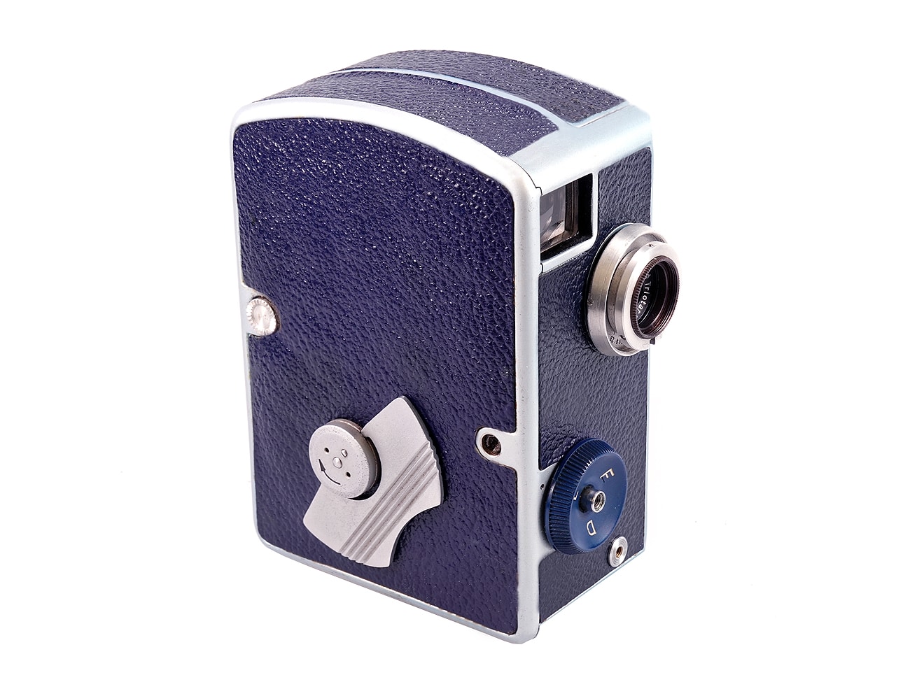 Beliebte Schmalfilmkamera aus der DDR (Dresden) für Doppel-8-Spulen, hergestellt ab 1954 in diversen Varianten und mit verschiedenen Objektiven. Hier mit fest eingebautem Objektiv Zeiss Jena Triotar 1:2,8/10 mm Seriennummer 4047642; Fixfokus. Fernrohrsucher. Federwerksantrieb (Einzelbild und 16 Bilder pro Sekunde; Schieber- statt Rotationsverschluss); manuelle Belichtungssteuerung; Drahtauslöseranschluss. Mit hohem Wiedererkennungswert: der drehbare Gangartenwahlschalter an der Frontseite (L = Laufbild, E = Einzelbild, D = Dauerlauf).