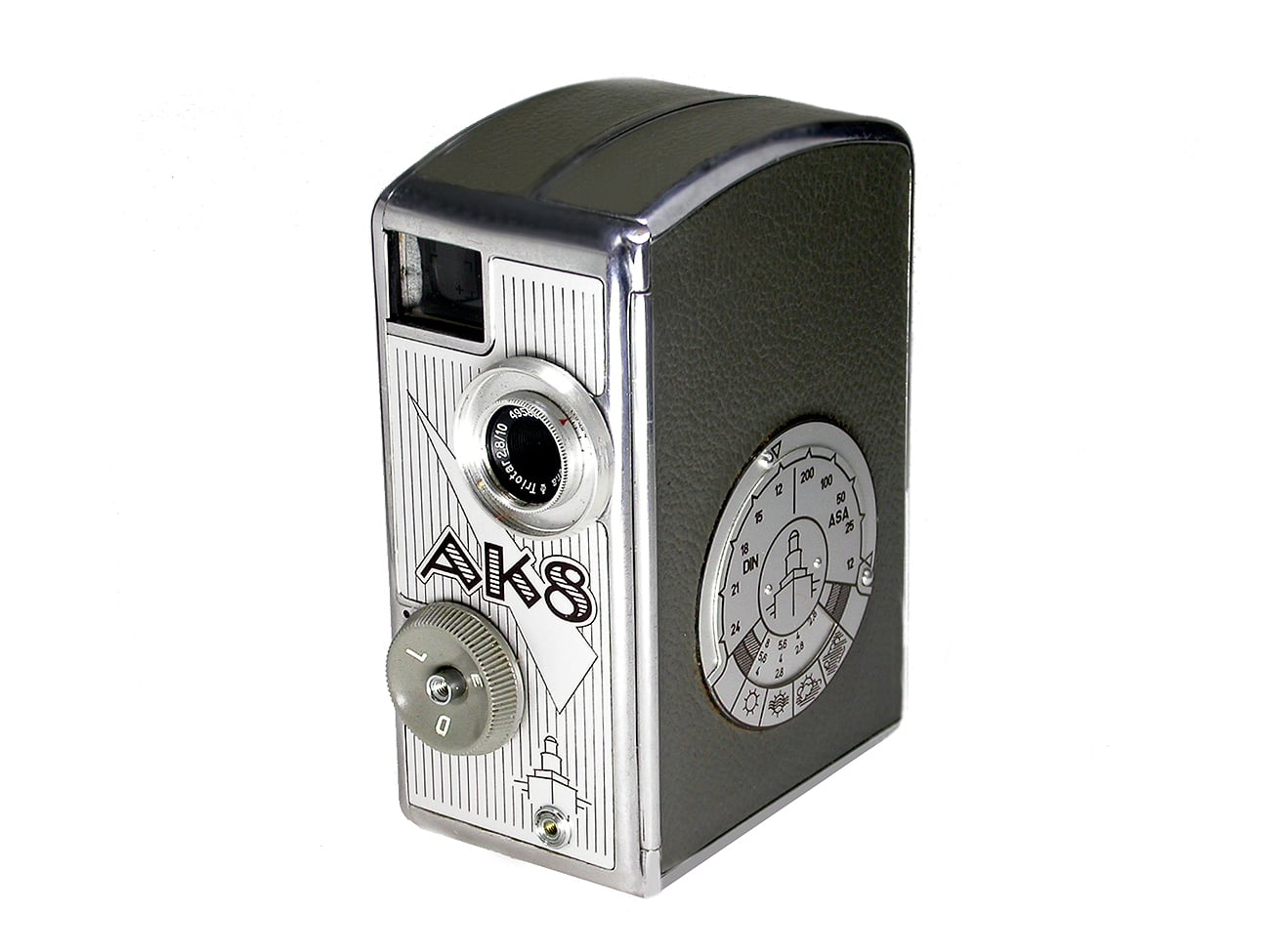 Beliebte Schmalfilmkamera aus der DDR (Dresden) für Doppel-8-Spulen, hergestellt ab 1957 in diversen Varianten und mit verschiedenen Objektiven. Hier mit fest eingebautem Objektiv Zeiss Jena Triotar 1:2,8/10 mm; Fixfokus. Fernrohrsucher. Federwerksantrieb (Einzelbild und 16 Bilder pro Sekunde); manuelle Belichtungssteuerung; Belichtungstabelle auf der linken Kameraseite. Drahtauslöseranschluss.