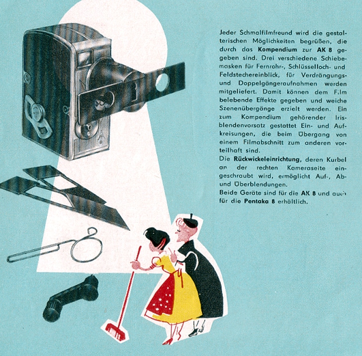 Kompendium zur Pentacon AK 8 mit Originalschachtel. Ein Adapterring wird ins Innengewinde des Objektivs geschraubt, an dem man wahlweise das Kompendium mit verschiedenen, verschiebbaren Trickmasken (Schlüsselloch, Fernglas, Fernrohr) aufstecken konnte oder einen Irisblendenvorsatz für „Ein- und Aufkreisungen“. Zusammen mit der als Zubehör lieferbaren Kurbel der so genannten „Rückwickeleinrichtung“ konnte man wunderschöne Auf- und Abblendungen als Szenenübergänge gestalten.