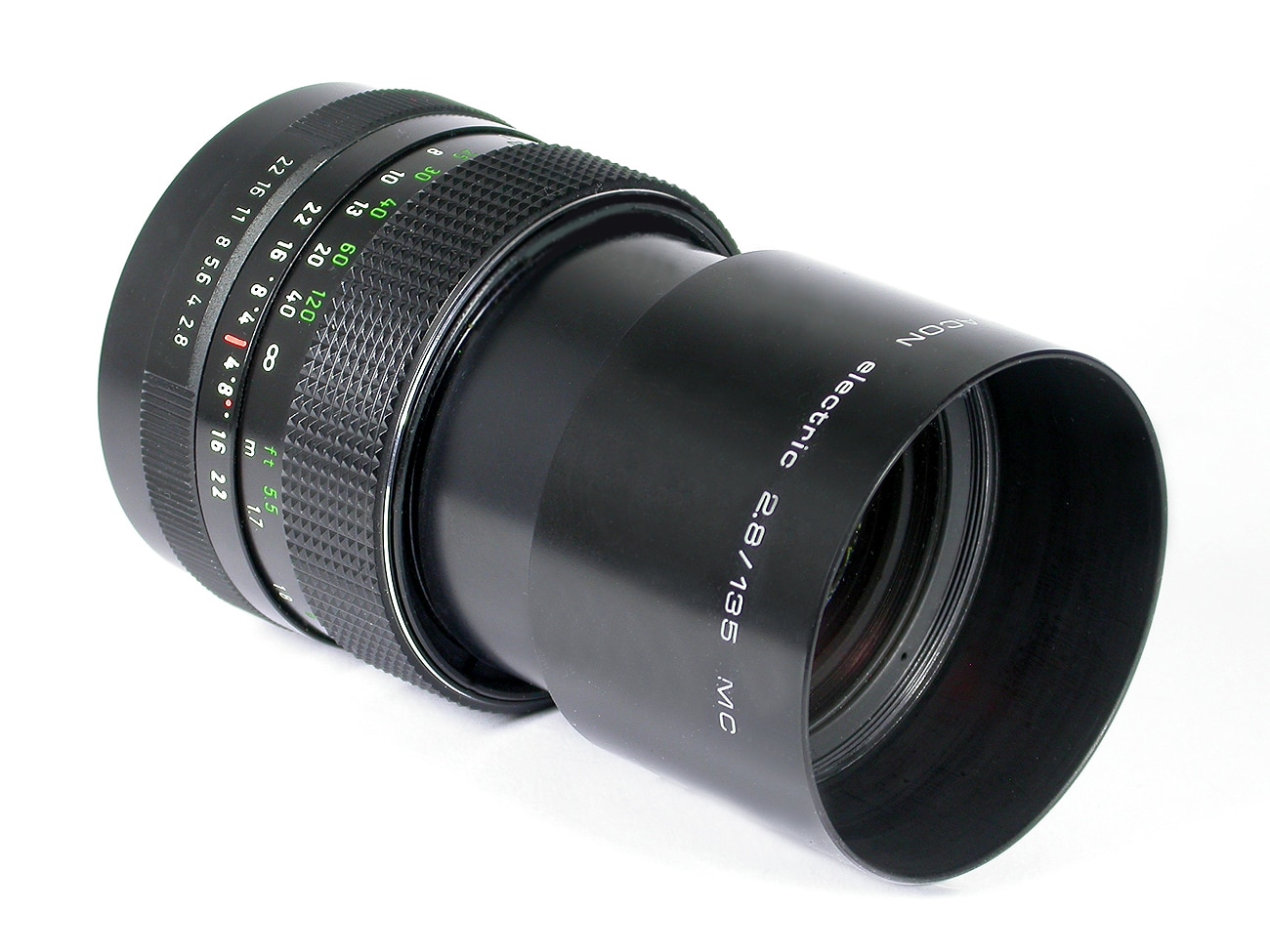 M-42-Teleobjektiv zur Praktica VLC 2 oder VLC 3: Pentacon electric MC 1:2,8/135 mm mit elektrischen Kontakten; integrierte Streulichtblende.