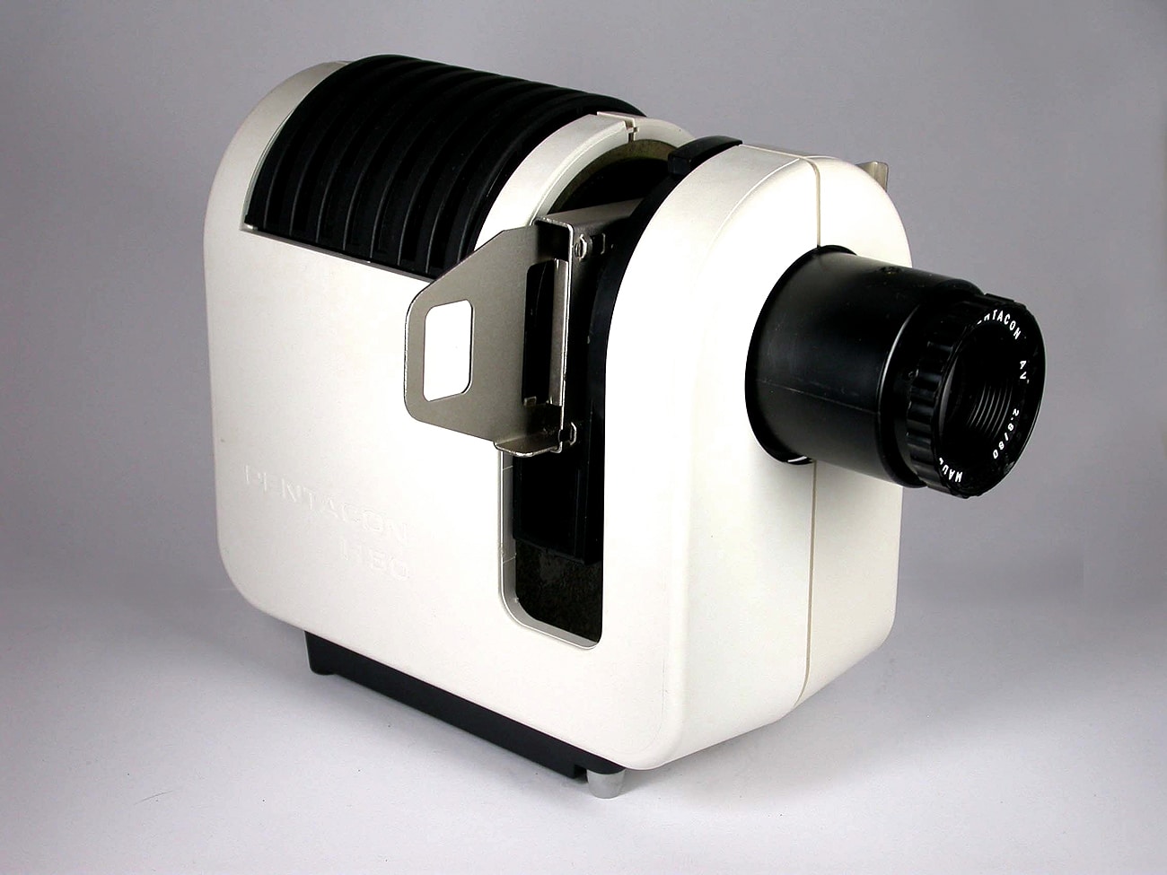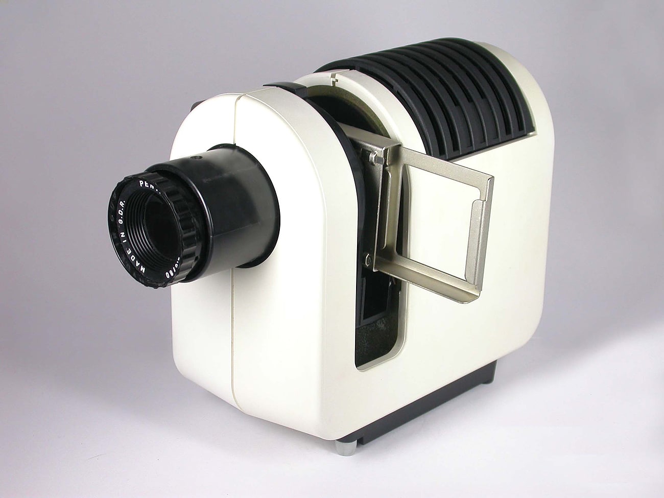 Sehr kompakter Kleinbilddiaprojektor aus der früheren DDR, 1984 hergestellt im „VEB Otto Buchwitz Starkstrom-Anlagenbau Dresden“ für Pentacon. Versenkbares Objektiv: Pentacon AV 2,8/80 – Made in G.D.R. Lampe: „Niedervoltbildwurflampe“ 12 Volt/50 Watt.