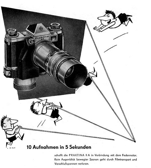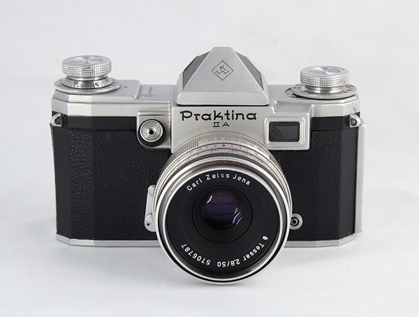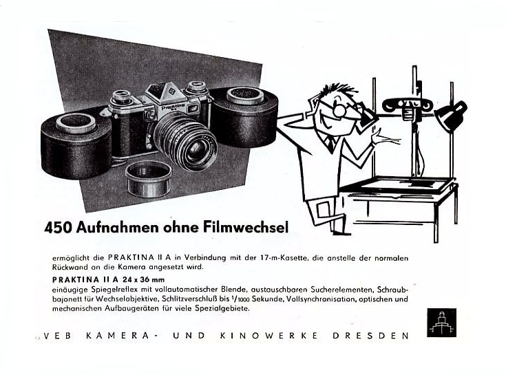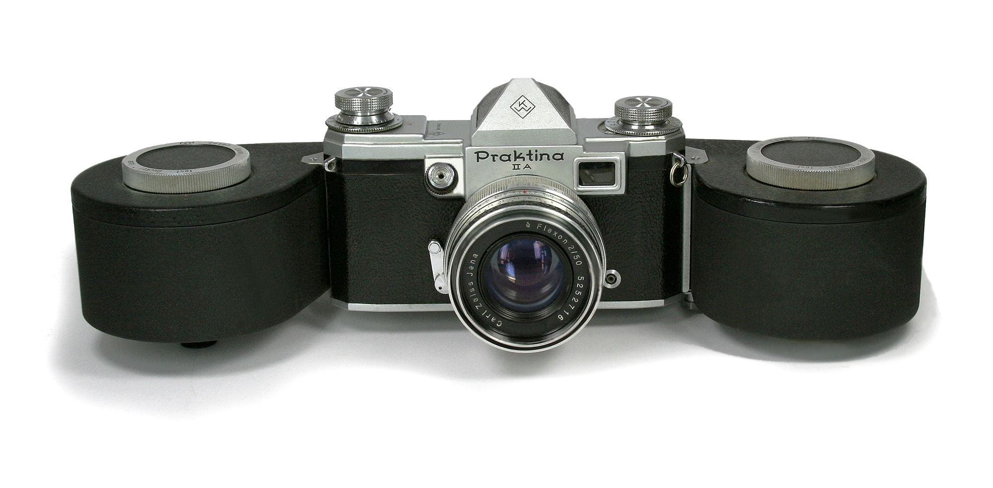 Ein Meilenstein der Kameratechnik: Die Systemkamera Praktina II A (1958-1961) aus dem Hause KW (Kamerawerke Niedersedlitz/Dresden; später: VEB Kamerawerke/VEB Pentacon), DDR. Erste KB-System-Kamera der Welt mit Wechselsucher und Motoranschluss (Federmotor oder Elektromotor mit Fernauslösung). Der Federwerksmotor ermöglichte etwa zwei Aufnahmen pro Sekunde. Die Praktina II A auf dem Foto weist statt des üblichen Prismas ein Prisma mit eingebautem Belichtungsmesser auf. Besonders interessant und selten bei einer SLR: Der „Sportsucher“ (rechts vom Kameranamen sichtbar).