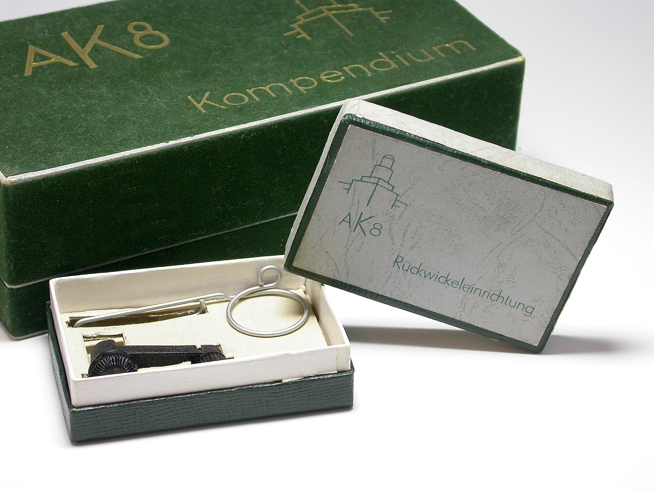 Rückwickeleinrichtung (mit Originalkarton), passend zur Schmalfilmkamera Pentacon AK 8. Mit der kleinen Kurbel kann man den Film ein Stück zurückdrehen, mit dem so genannten „Überblendhebel“ die Blende weich zu- oder aufdrehen.