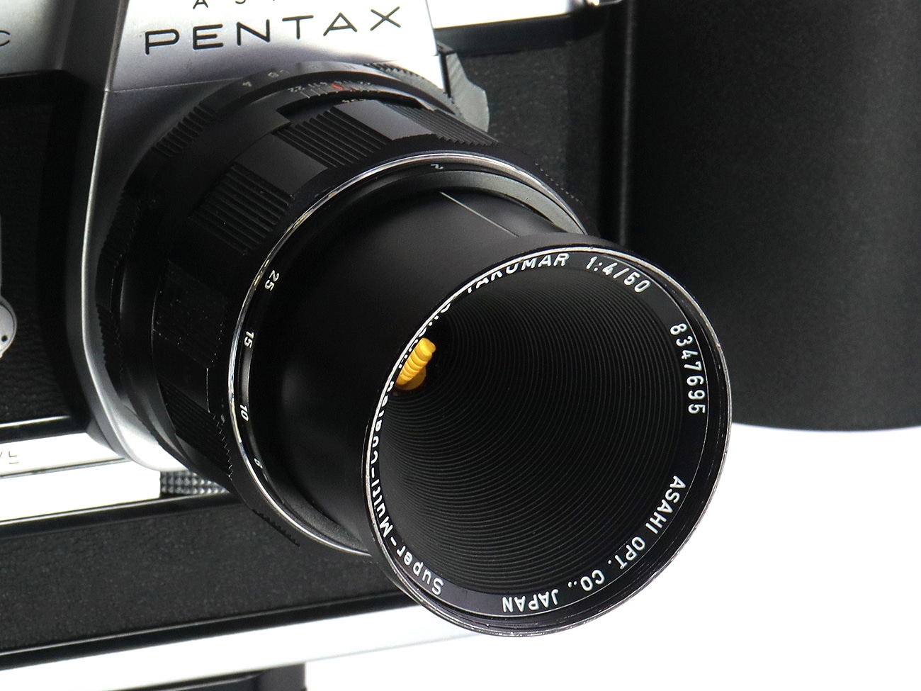 Japanisches Makro-Objektiv für alle Spiegelreflexkameras mit M-42-Gewinde. Das Asahi Super-Multi-Coated Macro-Takumar 1:4/50 mm kann das ab 23 Zentimeter scharfgestellt und bis 22 abgeblendet werden. Diese Pentax-Objektive besitzen einen Schärfentiefe-Kontrollschieber zum Schließen der Blende. Dadurch lässt sich die Schärfentiefe auf der Mattscheibe beurteilen. Weitere technische Daten: Kleinste Blende: 22; Bildwinkel: 27 ° (kurze Seite), 39,6 ° (lange Seite), 46,8 ° (Diagonale); 4 Elemente in 3 Gruppen; Filtergewinde: 49 mm; Gewicht: 265 Gramm.