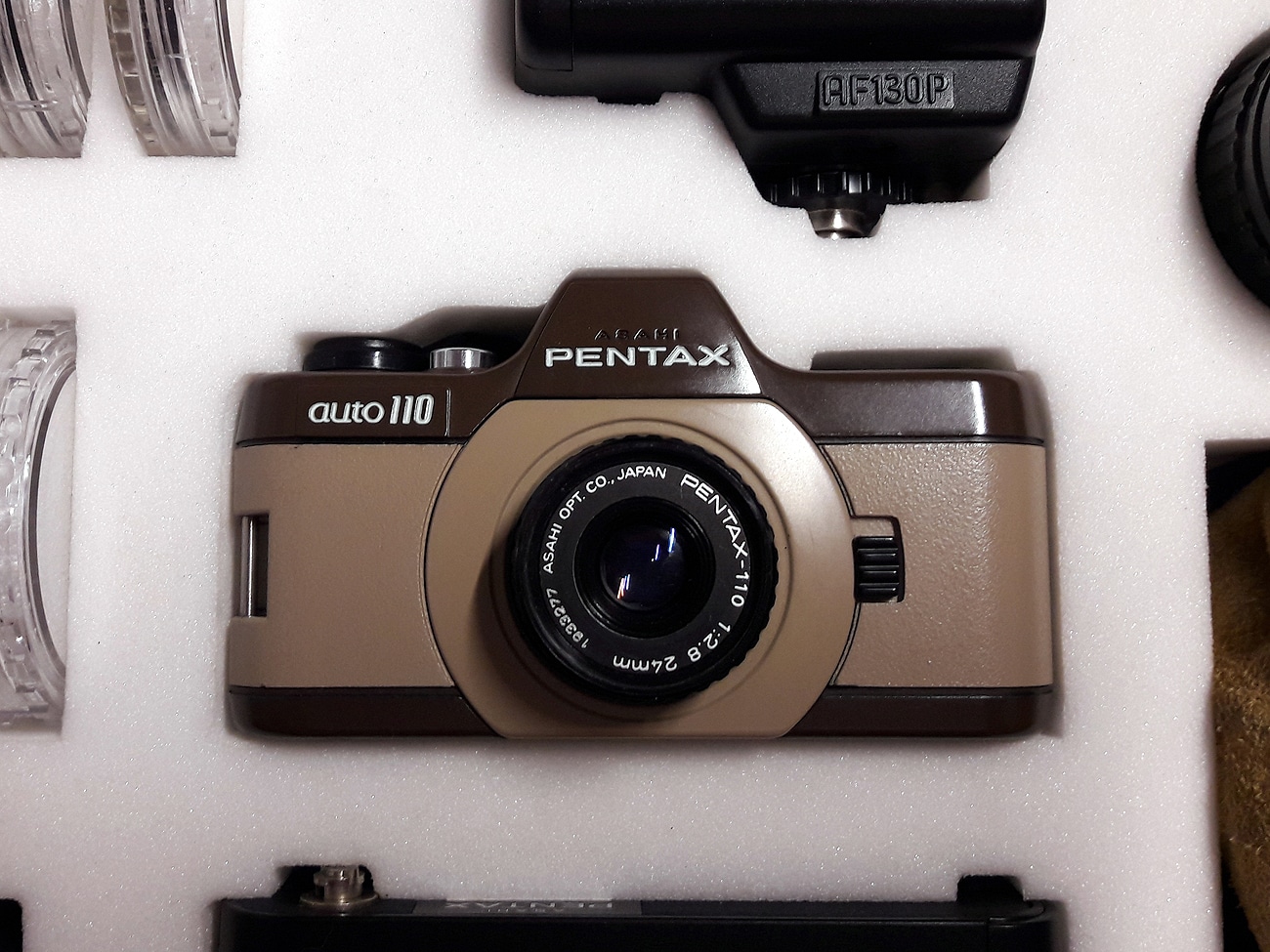 Sehr selten: Asahi Pentax Auto 110 in der begehrten Luxusausführung in brauner Farbgebung („Safari“). Eine Spiegelreflex-Systemkamera mit Wechseloptik (Pentax 110-Bajonett) für den Pocketfilm 110 (Aufnahmeformat 13 x 17 mm), hergestellt ab 1978. Diese Version und die Ausführung „Transparent“ gab es in den USA und Japan bis 1982. Belichtungsautomatik, Winderanschluss, aufsteckbarer Elektronenblitz. Manuelle Schärfeeinstellung, elektronischer Zentralverschluss, mittenbetonte Messung, Programmautomatik. An der Kamera ein Normalobjektiv Asahi Opt. Co., Japan Pentax-110 1:2,8/24 mm Seriennummer 1933277. Die 24 mm entsprechen 48 mm bei einer Kleinbildkamera. Abmessungen des Kameragehäuses: 99 x 58 x 33 mm.