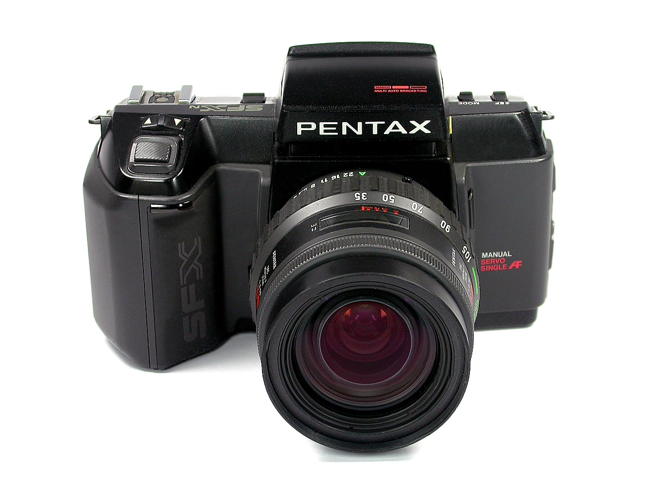Einäugige Spiegelreflexkamera (SLR) für den Kleinbildfilm 135 (Aufnahmeformat 24 x 36 mm), hergestellt ab 1988. Für Wechselobjektive mit Pentax KAF-Bajonett mit AF-Kupplung und Objektivkontakten. Objektive: SMC Pentax-F-Objektive. Objektive mit K- oder KA-Bajonett und einer Öffnung von 1:5,6 und größer lassen sich mit der elektronischen Schärfebestätigung einsetzen. Bei Objektiven mit einer Lichtstärke von 1:2,8 und größer ist Autofokus mittels AF-Adapter möglich. Hier mit dem SMC Pentax-F-Zoom 1:4-5,6/35-105 mm; manuelle Fokussierung oder Autofokus. Pentaprismensucher, wechselbare Einstellscheibe. Elektronisch gesteuerter Schlitzverschluss (30 Sekunden bis 1/4.000 Sekunde bei Programm- und Zeitautomatik; 1 bis 1/4.000 Sekunde bei Blendenautomatik und Nachführmessung; elektronischer Selbstauslöser). Mittenbetonte Messung, manuelle Belichtungssteuerung, Blenden-, Zeit- und Programmautomatik. Eingebautes TTL-Blitzgerät mit Strahlprojektor, LZ 14. Blitz-Synchronzeit: 1/125 Sekunde. Stromversorgung: Eine 6-Volt-Lithium-Batterie oder vier 1,5-Volt-Mignon-Batterien. Eingebauter Motor.