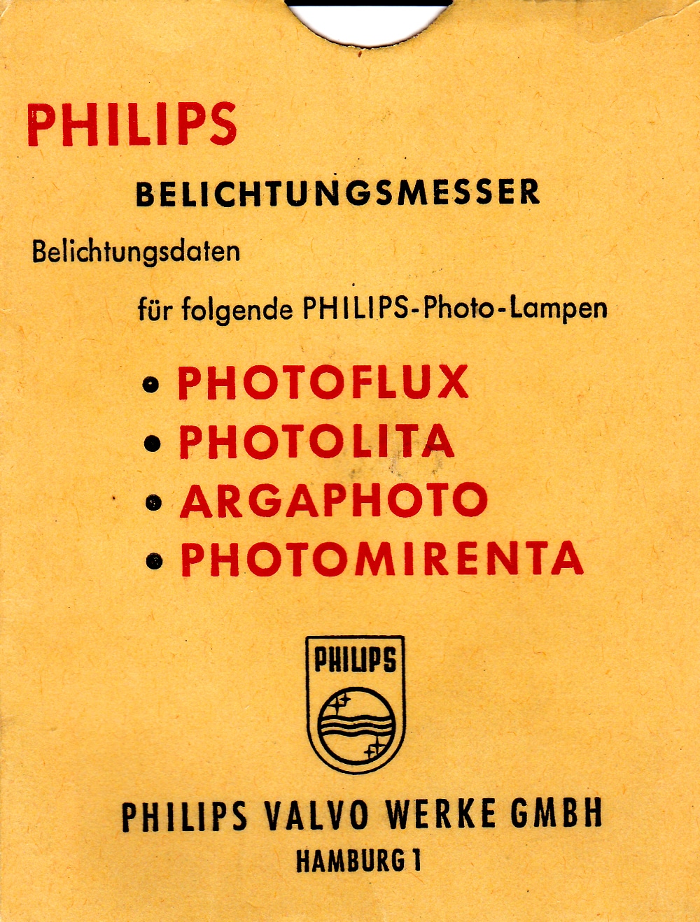 Belichtungsmesser in Form einer Rechenscheibe mit Belichtungsdaten für Philips-Fotolampen, hergestellt von Philips Valvo Werke GmbH, Hamburg 1, vermutlich um 1950. Schutzkarton bzw. Schuber mit rückseitiger Bedienungsanleitung; darin befindlich die Rechenscheibe. Eingestellt wird die Entfernung der Lampe zum Aufnahmeobjekt in der Zeile mit dem verwendeten Lampentyp. Danach können unten unter Berücksichtigung der Filmempfindlichkeit die möglichen Zeit-/Blendekombinationen abgelesen werden. Blendenwerte von 2,8 bis 32 bzw. von 2,0 bis 22; Filmempfindlichkeiten von 20 bis 250 ASA (Angaben auch in DIN und Scheiner-Graden).