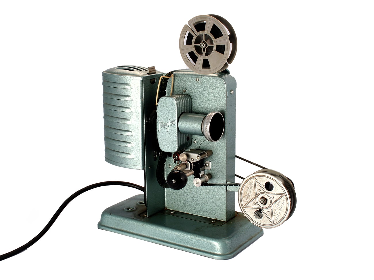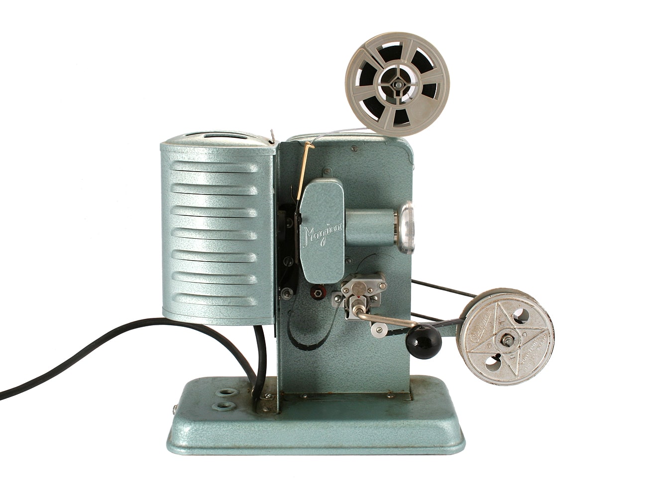 Kinderspielzeug aus dem Jahre 1950: der 16-mm-Ozaphan-Projektor der Nürnberger Firma Plank (Noris) mit Handkurbel. Der Filmvorschub erfolgt über lediglich eine Zahntrommel im Ablauf, nicht sehr filmschonend aber der Einfachheit geschuldet. Elektrische Beleuchtung (100 Watt/220 Volt), kein Gebläse. Ein Motor konnte nachgerüstet werden. Die Bilder zeigen die Standard-Spulengröße 7,5 cm, auch die 13-cm-Standardspule ist noch möglich. Für die Rückspulung stand ein separates manuelles Gerät zur Verfügung. Den Projektor gab es auch in anderen Farben, zum Beispiel in einem für Projektoren doch eher ungewöhnlichen Rot oder in dunkelgrün. Eine etwas aufwändigere Variante dieses Projektors verfügt über längere Spulenarme für größere Spulendurchmesser sowie einen zusätzlichen Zahnrollenantrieb im Zulauf. Ozaphan ist eine Marke der Firma Kalle, Wiesbaden, die 1923 ein Patent auf diesen silberfreien, aber nicht sehr reißfesten Film anmeldete.