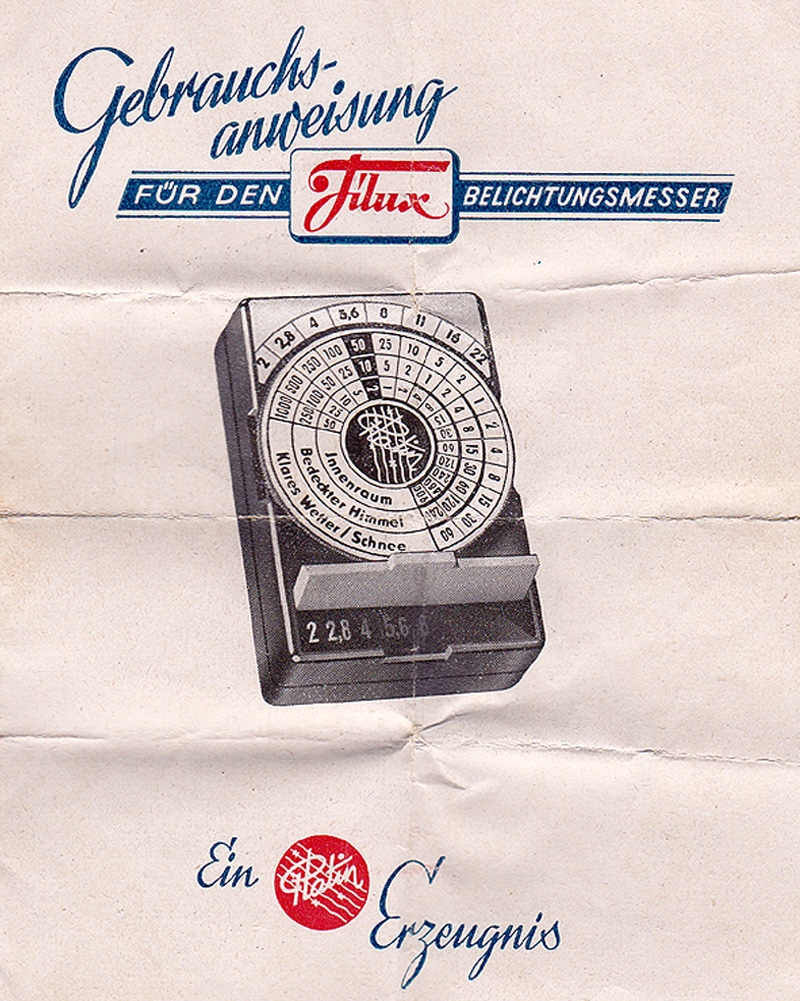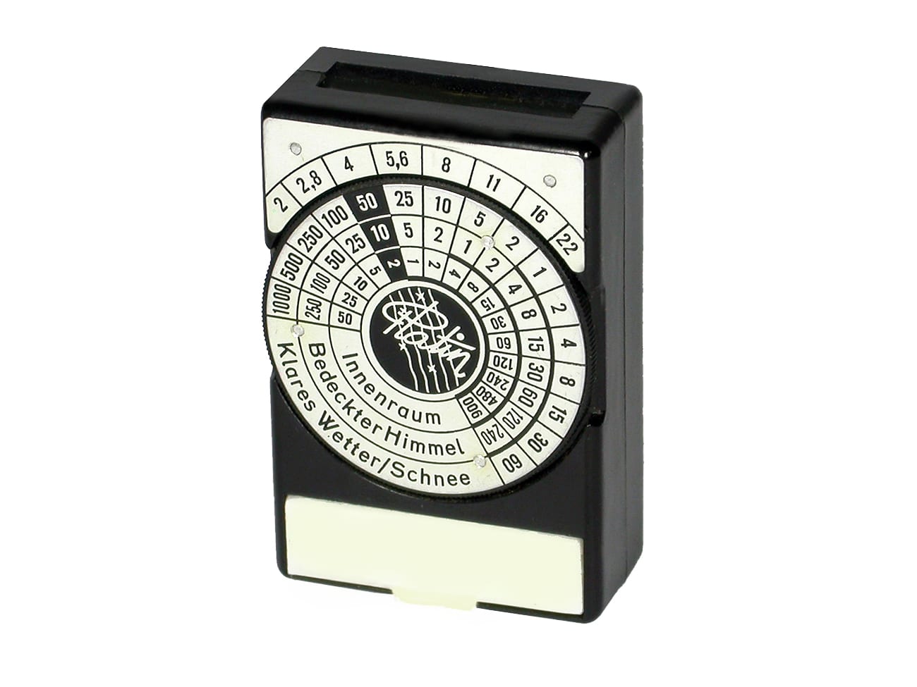 Einfacher optischer Belichtungsmesser, produziert vom Platin-Werk Gerhard Räder, Neukirchen (Erzgebirge/DDR), etwa 1955. Vorlage für diesen in mehreren unterschiedlichen Versionen gebauten Belichtungsmesser ist der Expophot von Rudolf Kiesewetter, Excelsior-Werk, Leipzig. Dort wurden noch bis etwa 1958 Belichtungsmesser hergestellt. Im Museum mit Original-Bedienungsanleitung.