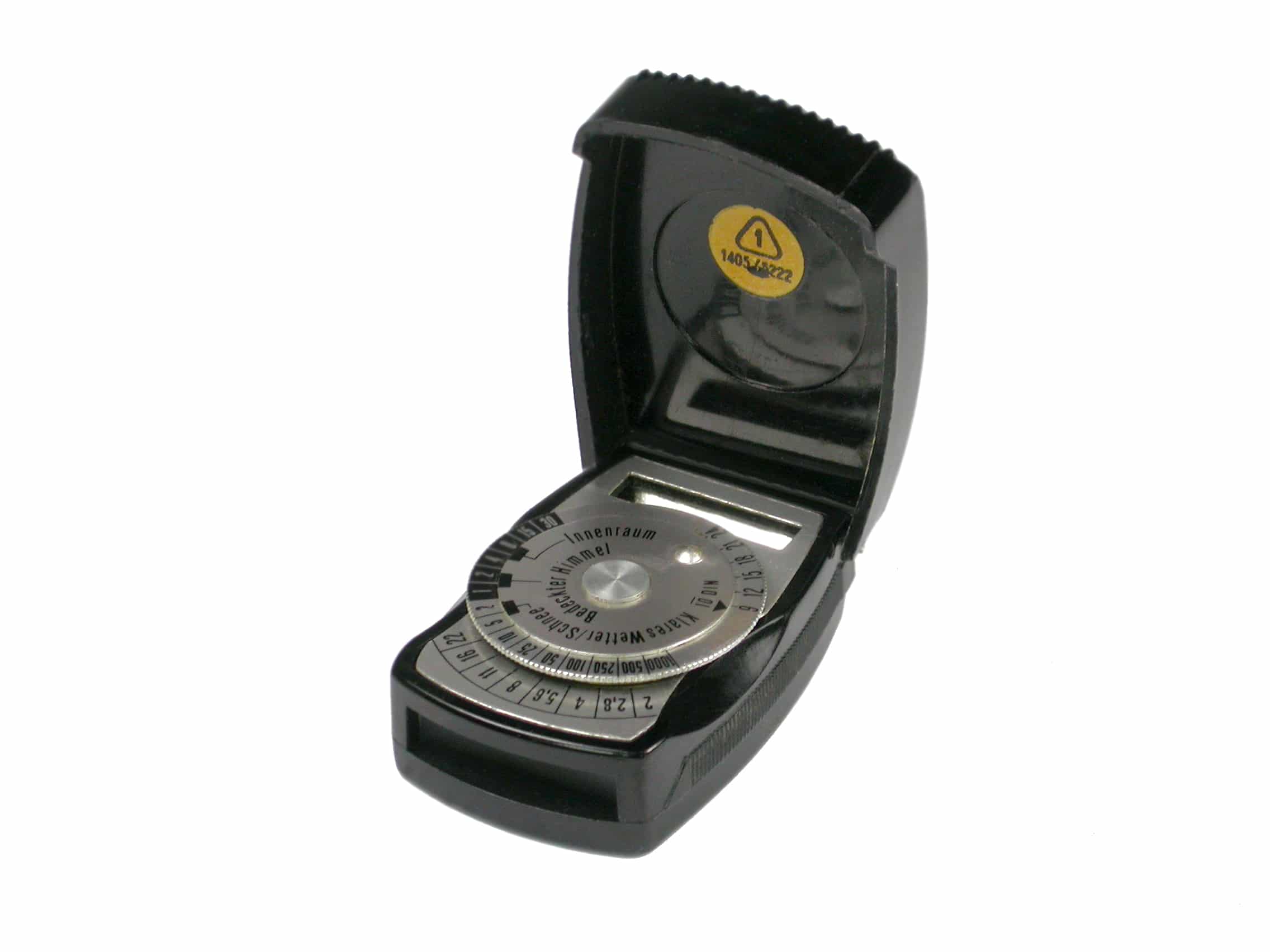 Optischer Belichtungsmesser im Bakelitgehäuse (Platin-Werk Gerhard Räder, Neukirchen, Erzgebirge), Ende 1950er Jahre. Das Funktions- und Bedienungsprinzip geht zurück auf den Expophot von Rudolf Kiesewetter, Excelsior-Werk. Blendenwerte 2 bis 22; Belichtungszeiten 1/1.000 Sekunde bis 30 Sekunden; Filmempfindlichkeiten 9 bis 24 DIN. Mit DDR-Gütezeichen „1“ im Deckel = „Güteklasse 1 für gute Qualität“ (Erzeugnisse, die dem Durchschnitt des Weltmarktes entsprachen).