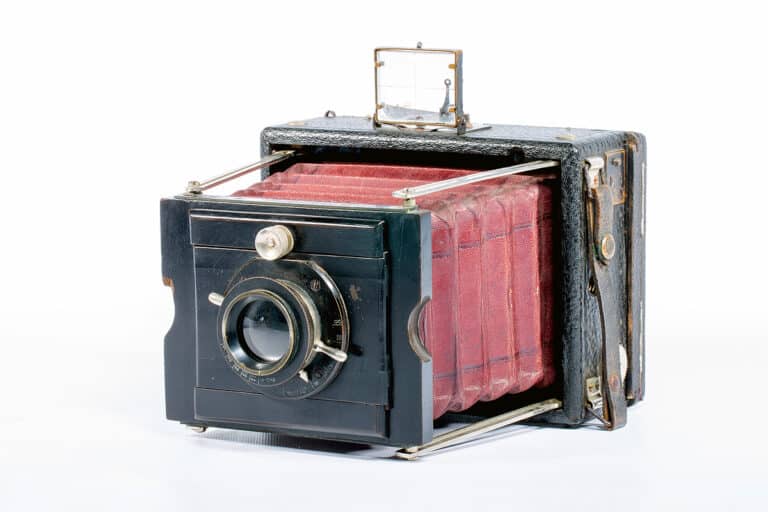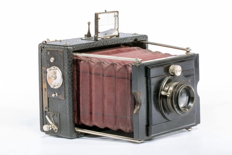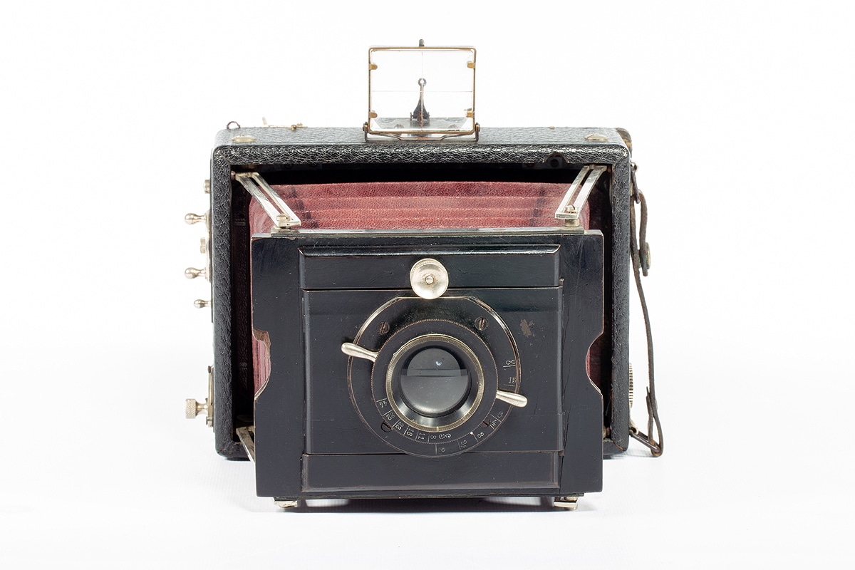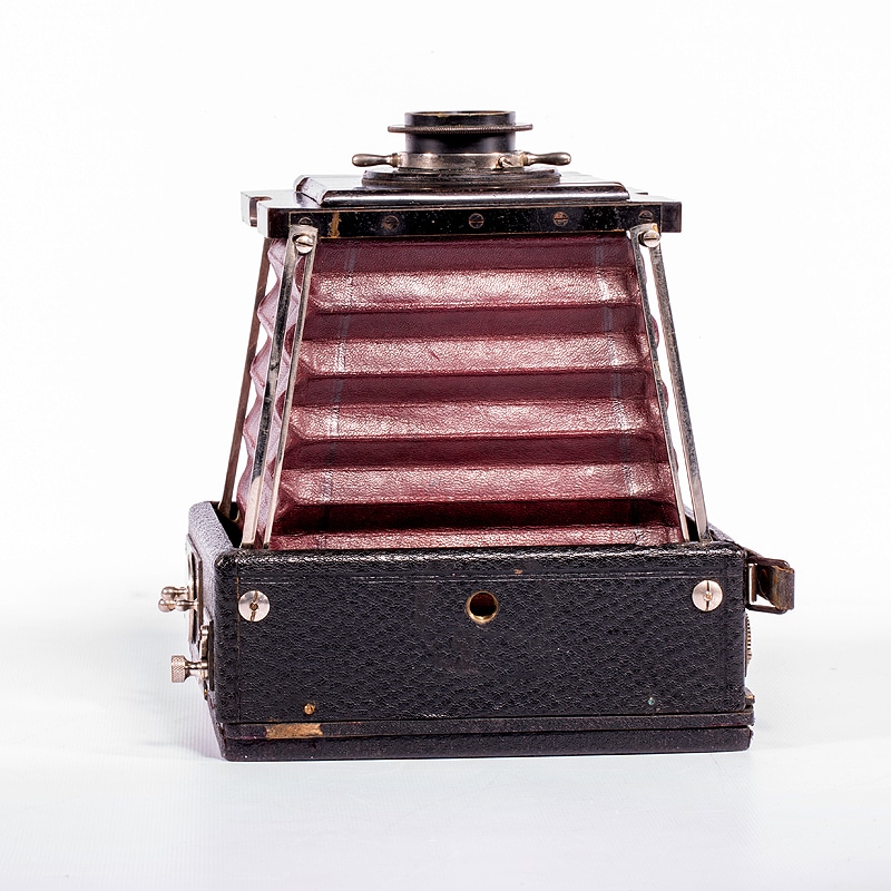 Klapp-/Spreizenkamera für Platten (Negativformat 9 x 12 cm). Objektiv: unbezeichnet. Rahmensucher.  Verschluss: unbezeichnet. Herstellungszeit: vermutlich nach der Jahrhundertwende.