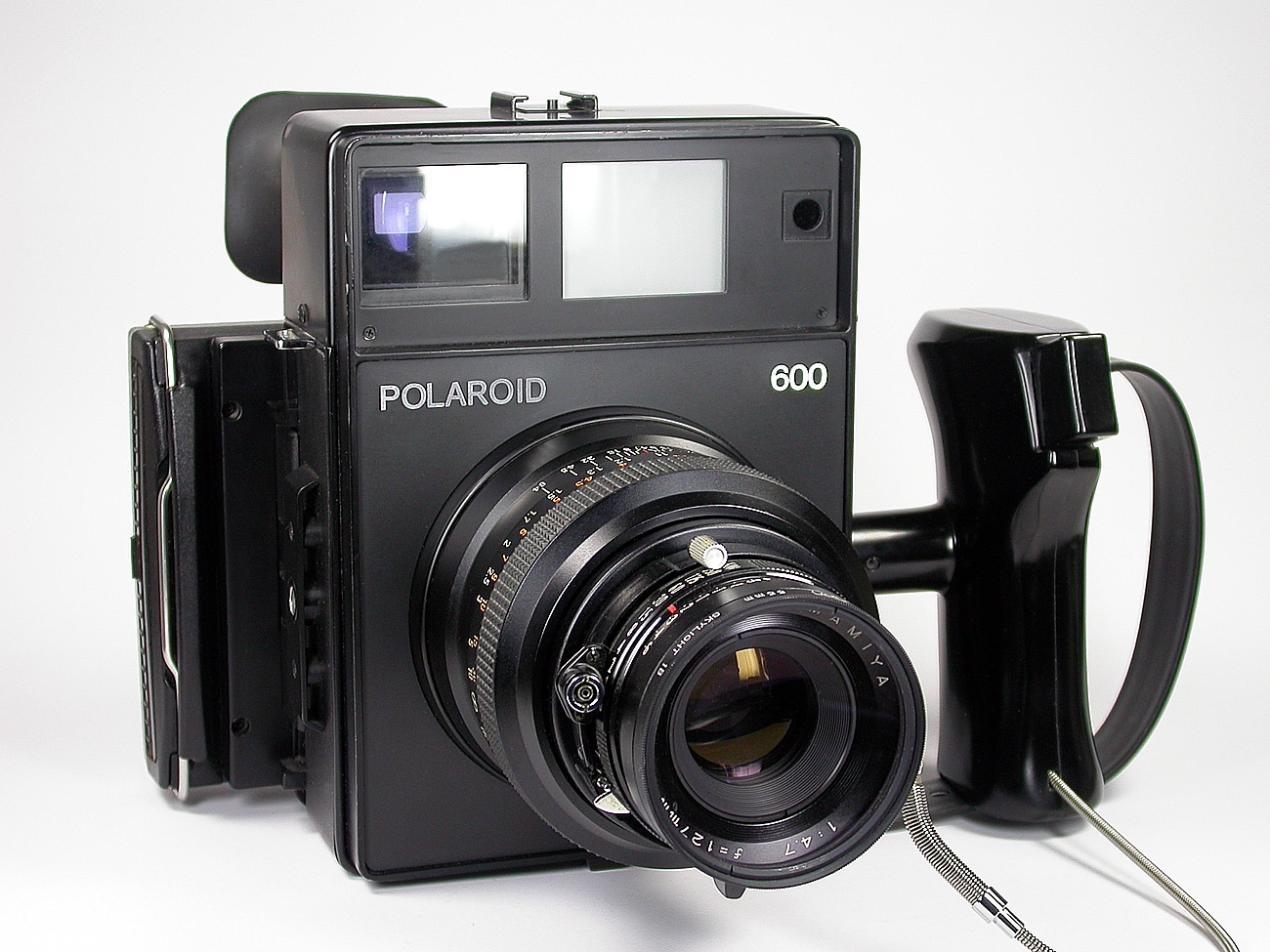Sofortbild-Profikamera (gebaut von Mamiya, Japan, 1978) für das Format 6 x 9 cm mit Wechselrückteil und fest eingebautem Normalobjektiv. Leuchtrahmensucher mit automatischem Parallaxenausgleich und Mischbild-Entfernungsmesser. Objektiv: Mamiya Vier-Element-Konstruktion, vergütet. 1:4,7/127 mm mit Zwischenlinsen-Verschluss. Einstellbereich von 1 Meter bis unendlich. Blendenwerte: Von 4,7 bis 64 in internationaler Einteilung. Verschlusszeiten: Von 1 Sekunde bis 1/500 Sekunde und B. X-Synchronisation für Elektronenblitz bei allen Belichtungszeiten. Steckschuh für Blitzgeräte und Zubehör auf dem Suchergehäuse, ohne Mittenkontakt. Stativanschluss: Gewinde am Kameraboden und rechts am Gehäuse, 1/4″. Hier mit Polaroid-Rückteil (z.B. für den Film 664).
