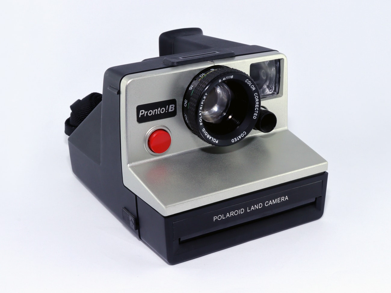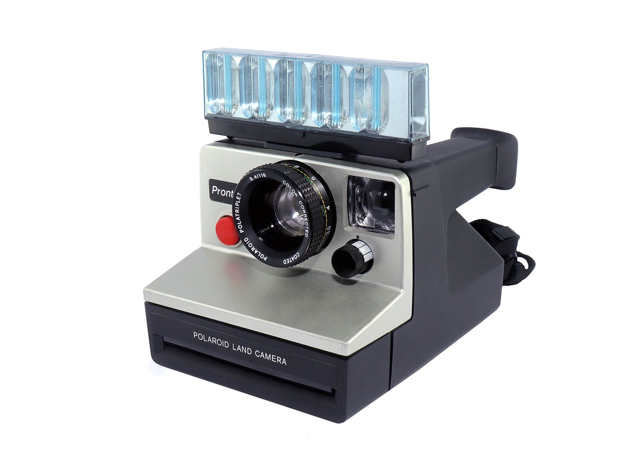Seltene elektronische Sofortbildkamera (1976-77) von Polaroid für den SX-70-Film. Belichtungsautomatik, manuelle Schärfeeinstellung (ab 0,9 Meter) mit Objektiv Polaroid Polatriplet 1:9,4/116 mm (3 Elemente), automatischer Bildauswurf. Blitzanschluss für Flashbar. Trageriemen.
