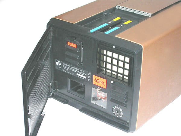 Das Bild oben zeigt diesen Player, der völlig ohne Bedienungsknöpfe und Schalter auskam. Der Abverkauf der Restbestände erfolgte Ende der 1980er Jahre. Der Mattscheiben-Projektor „Made in Austria“ war für Netzspannungen von 100 bis 240 Volt (50 Hz) ausgelegt und leistete insgesamt 240 Watt. Verwendet wurde eine Lampe mit 12 Volt und maximal 100 Watt.