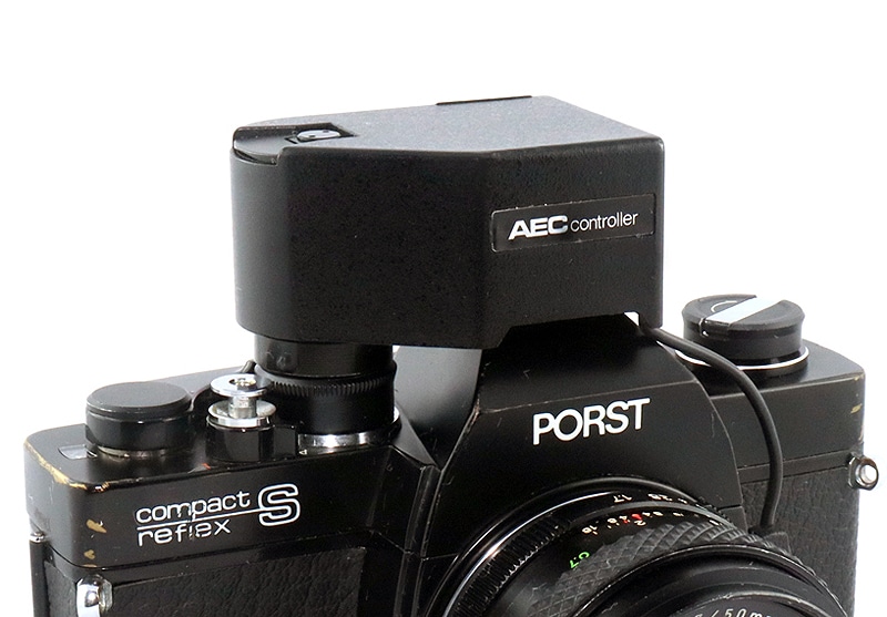 Mit dem “AEC-Controller” (Bild), der als Zubehör erhältlichen automatischen Zeitsteuerung, werden Porst-Kleinbildspiegelreflexen wie die Compact Reflex S (im Bild) laut Bedienungsanleitung “zum Vollautomat”. Das Gerät wird in den Zubehörschuh gesteckt und per Kabel mit der oberen Buchse rechts vom Objektiv verbunden. Es wird dann automatisch zur vorgewählten Blende stufenlos die richtige Verschlusszeit gewählt. Stromversorgung: 6-Volt-Silberoxidbatterie (Typ 4 G 13).