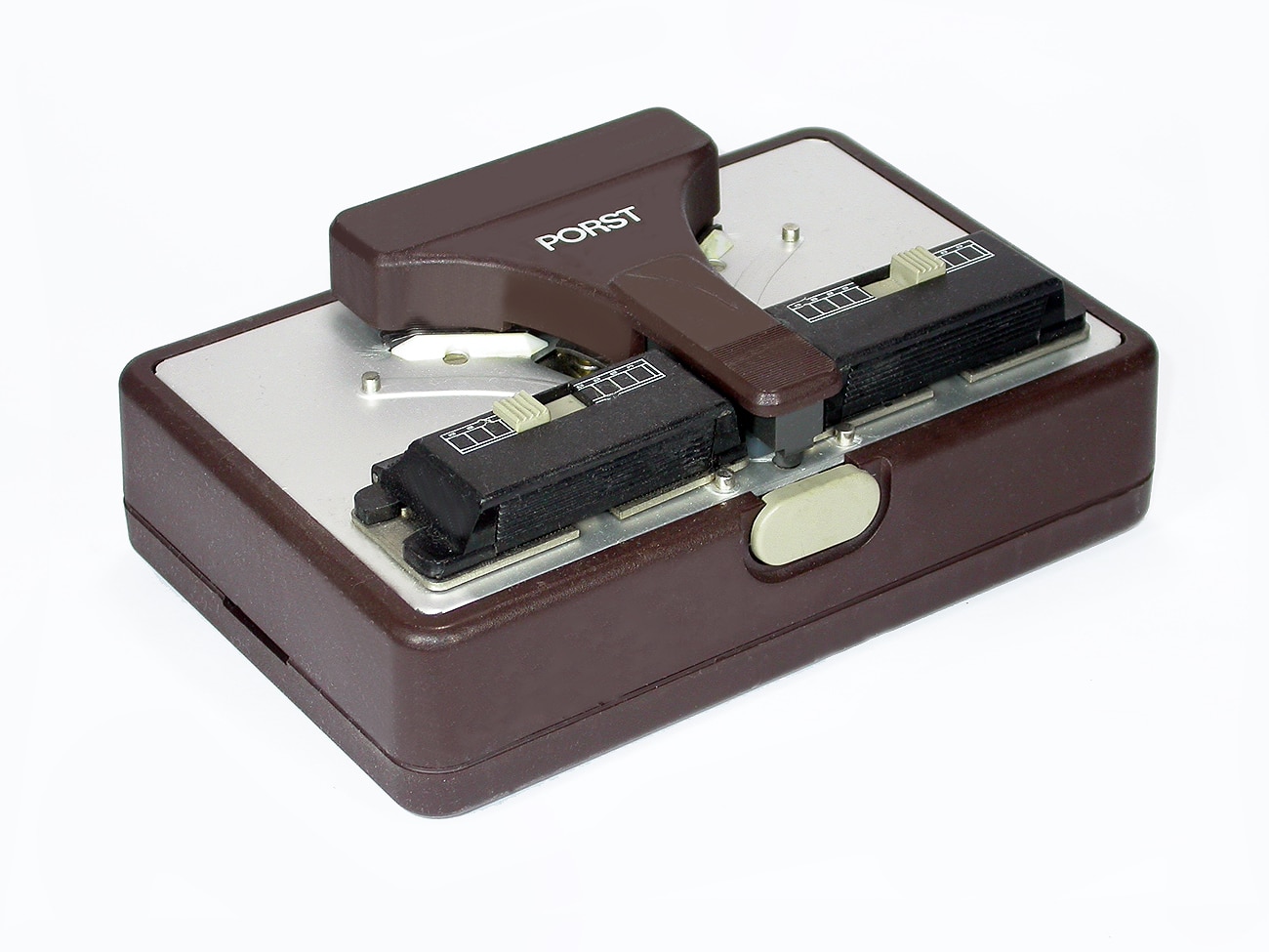 Hochwertige motorisierte Klebepresse für Super-8-Film von Photo Porst, Schwabach. Mit „motorgetriebener Saphir-Doppeldrehscheibe“ zum automatisch startenden Anschleifen der beiden Filmenden; Stromversorgung durch externes Netzteil oder zwei 1,5-Volt-Babyzellen.