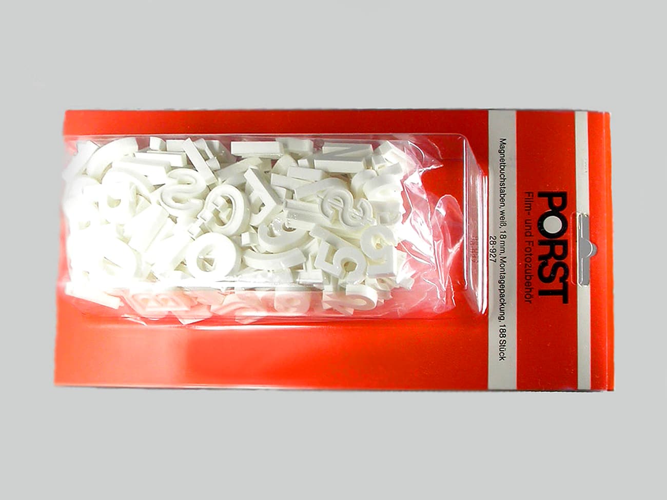 Zubehör für Schmalfilmer: Etwa 1,8 Zentimeter hohe magnetische Titelbuchstaben. So konnten auf einer Metallplatte, oft mit einem Foto oder einer Landkarte dekoriert, passende Filmtitel nachträglich erstellt und vor den fertigen Film oder als Abspann an das Ende geklebt werden. 188 weiße Buchstaben in der hier noch ungeöffneten Original-Blister-Verpackung, 1970er Jahre.
