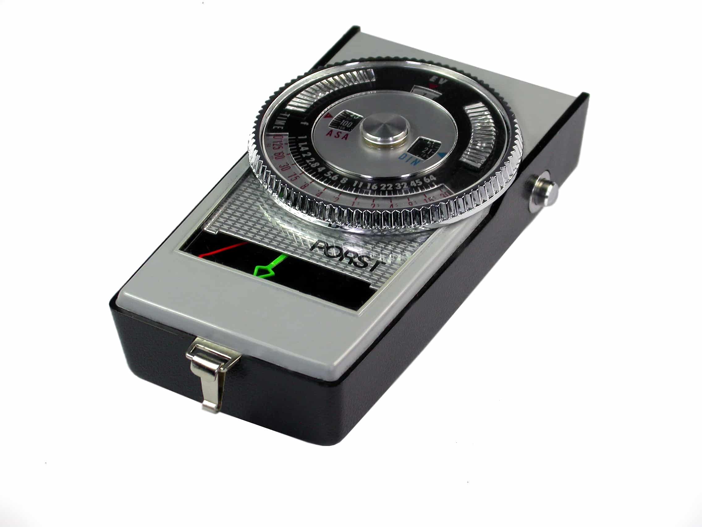 Fotoelektrischer Handbelichtungsmesser, hergestellt vermutlich in den 1970er Jahren. Messbereich von 9 bis 45 DIN (6 bis 25.000 ASA), Zeiten von 1/8.000 Sekunde bis 1 Stunde, Blenden von 1 bis 64, Lichtwerte von -3 bis 25. Mit vorschiebbarer Kalotte für Objektmessung und eingebautem Batterietester.