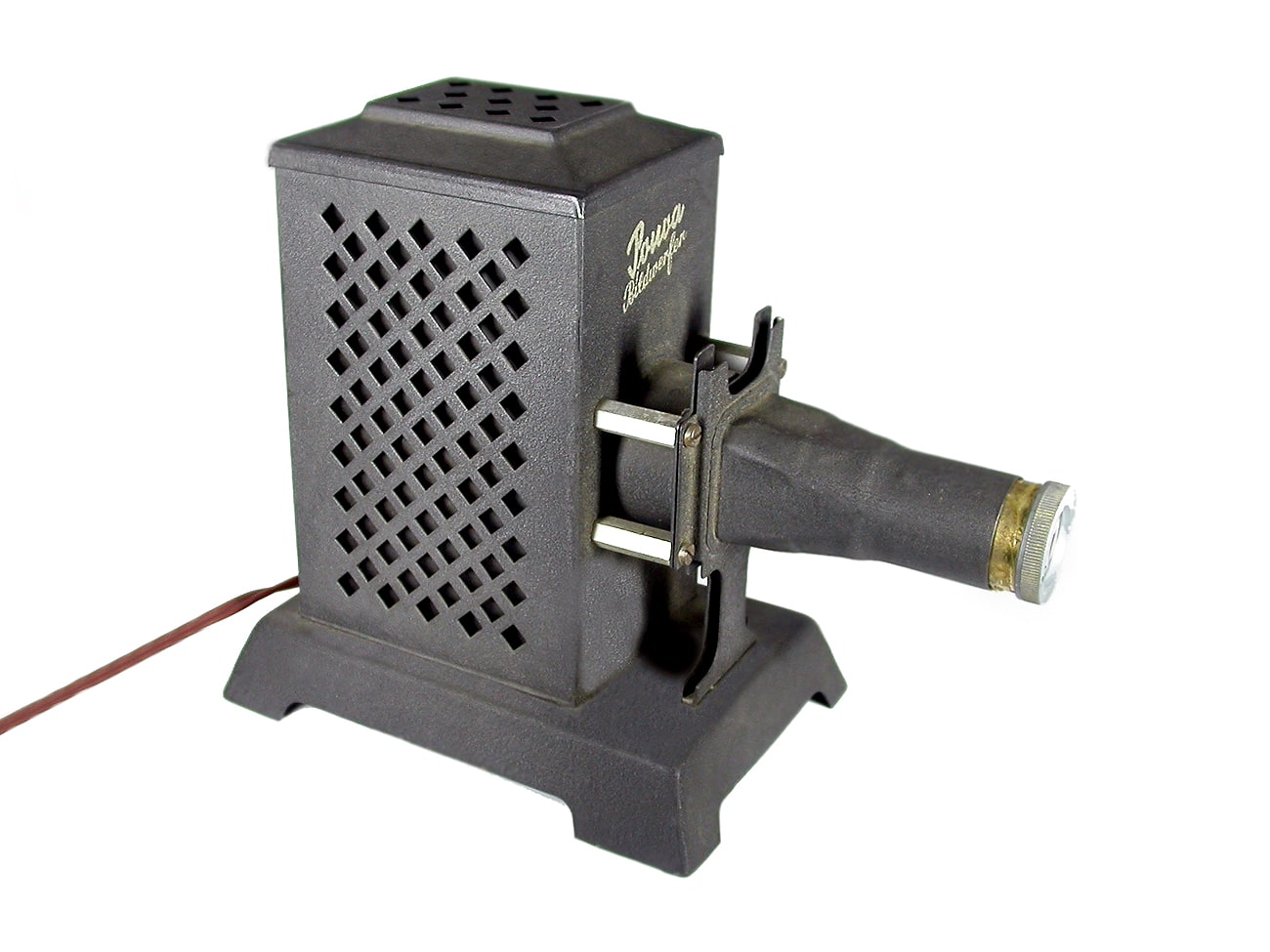 Einfaches Diaprojektor für das Kleinbildformat. Gehäuse aus Metall, schwarze Hammerschlaglackierung. Diatransport im System Fallschacht: Oben wird ein Dia in den Strahlengang eingeführt, unten im Fallschacht wird ein „Dummy“ oder ein bereits projiziertes Dia entnommen, sodass oben wieder Platz für ein neues Dia wird, das dann wieder nach unten rutscht und so fort… Hochvoltlampe ohne Gebläse oder Schalter, Objektiv: „Pouva Proj.-Anastigmat 1:4,5/10 cm“.