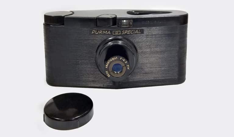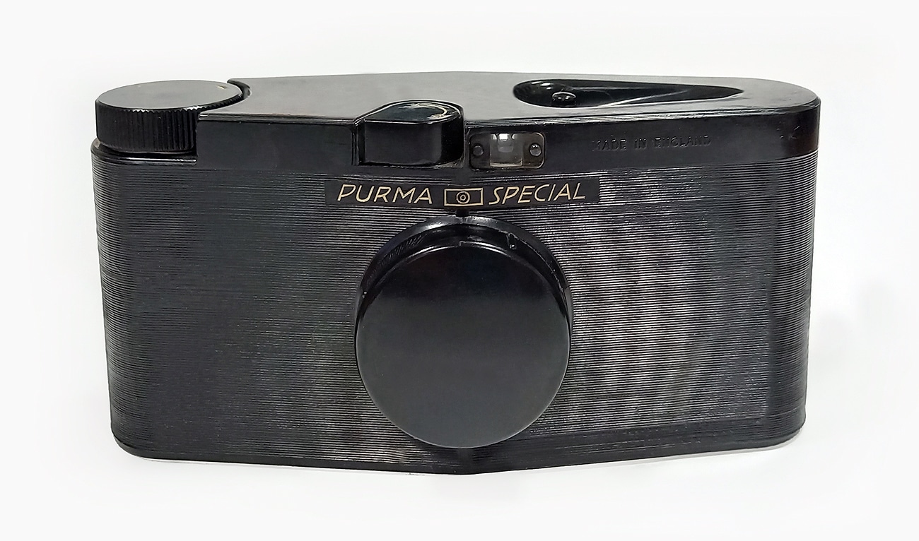 Eine sehr interessante englische Bakelit-Kamera für den 127er-Rollfilm (16 quadratische Negative mit 31 x 31 mm) aus den Jahren 1937 bis 1959 (während des Zweiten Weltkriegs war die Produktion unterbrochen). Tom Purvis, ein bekannter Künstler, und Alfred C. Mayo gründeten 1935 in London die Firma Purma Cameras Ltd. Die Apparate der Marke Purma waren Rollfilmsucherkameras mit patentierten schwerkraftgesteuerten Verschlüssen. Purma-Kameras und Zubehör wurden von RF Hunter aus London verkauft. Das Modell Purma Special kommt am häufigsten vor und besteht aus Bakelit, abgesehen von der Glaslinse, der Kunststoff-Sucheroptik und den Verschluss- und Federmechanismen aus Metall. Die Purma soll die erste Kamera sein, die über eine Kunststoffoptik verfügt, wenn diese auch nur im Sucher zum Tragen kommt.